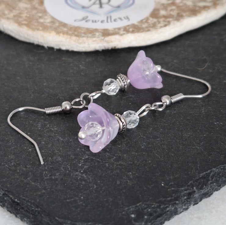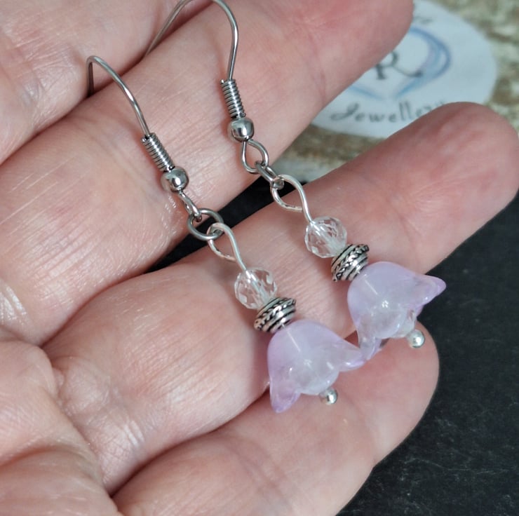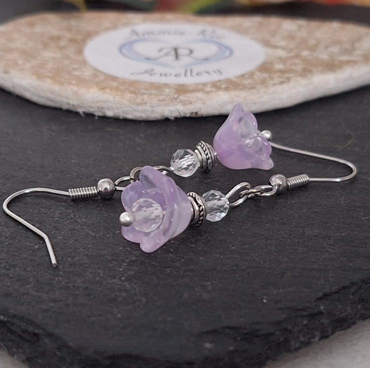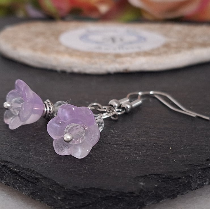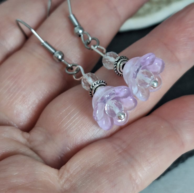 These delicate and delectable glass flowers are in a pale pretty ombre lilac and I've are paired them with faceted Topaz beads, then presented them on silver plated headpins with stainless steel hypoallergenic earring hooks for your comfort.