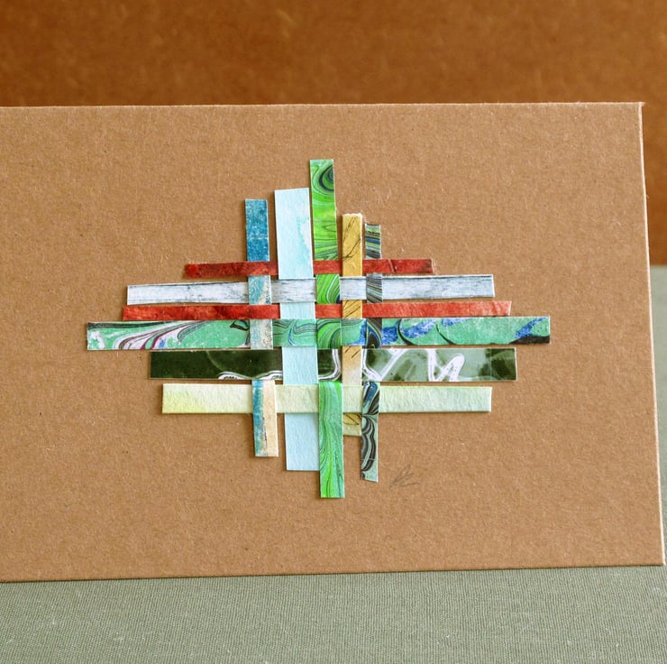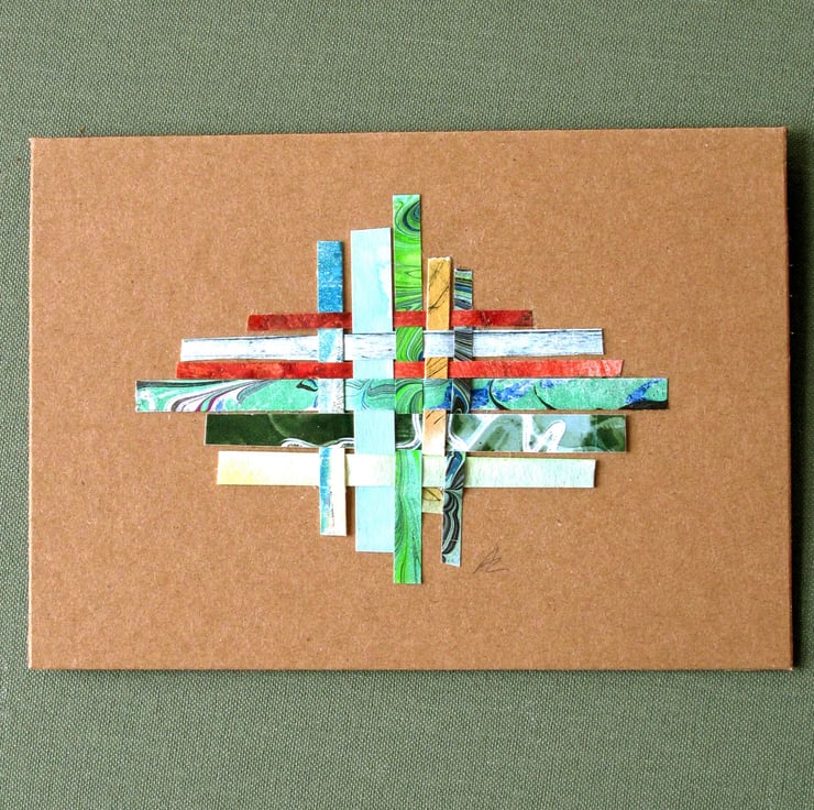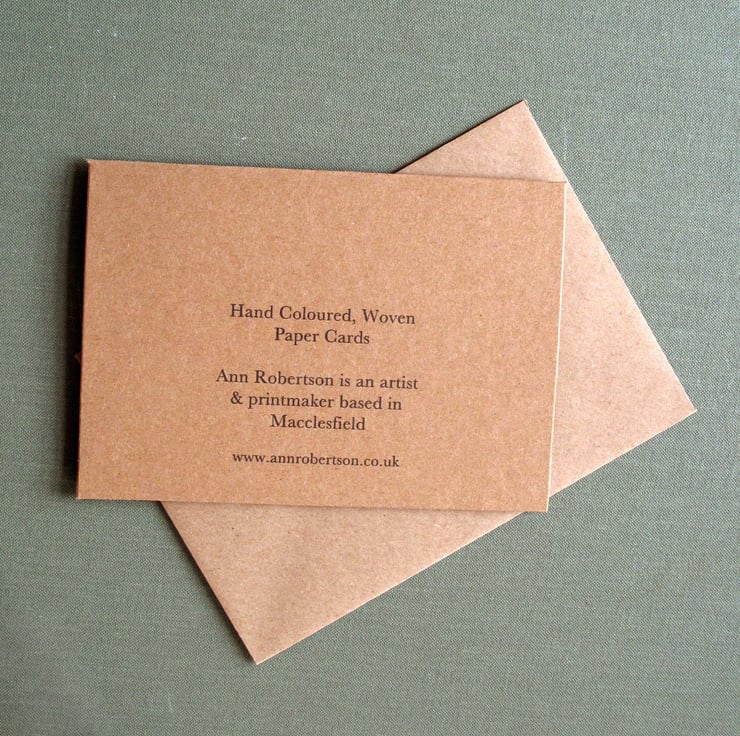 Blank greeting card. Original art work by Ann Robertson. Woven paper strips mostly from hand printed papers, mounted on Kraft paper card. A6 width 14.8 cm height 10.3 cm. Top fold. Plain Kraft paper envelope.