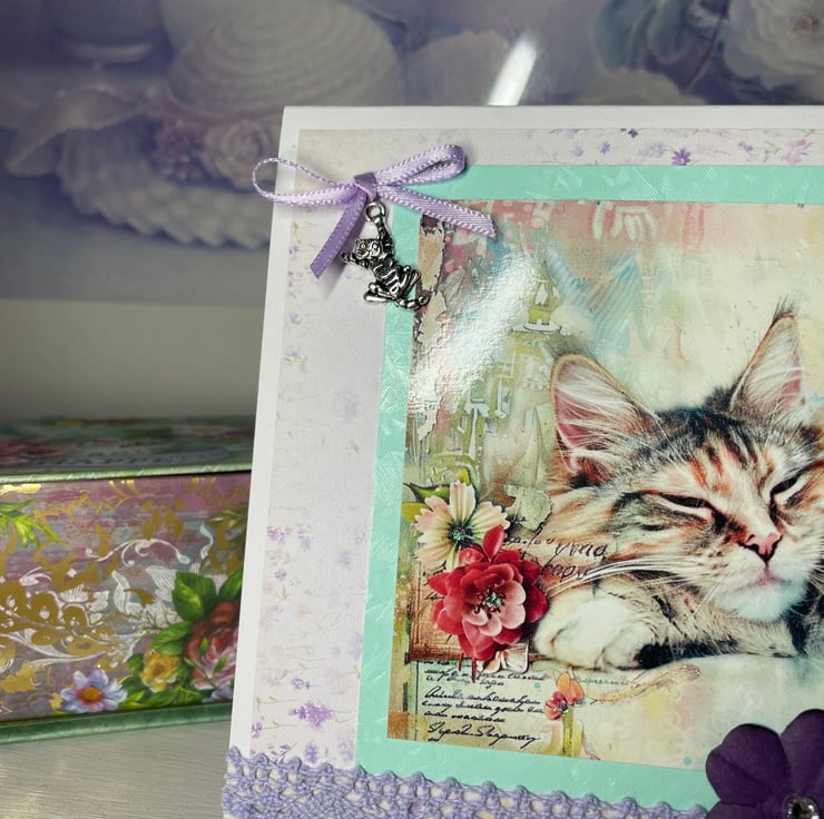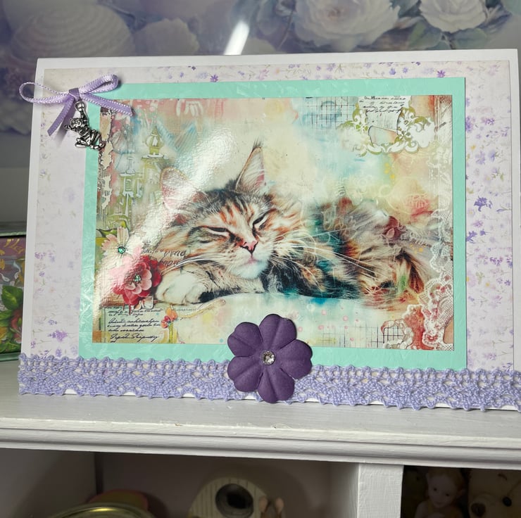 Cosy cat greeting card. Floral background, aqua mount, with a glossy photo topper. Cat charm and is, lace trim with a paper flower with a diamanté centre. Measures 5” x 7”. The insert has been left blank for your own message.