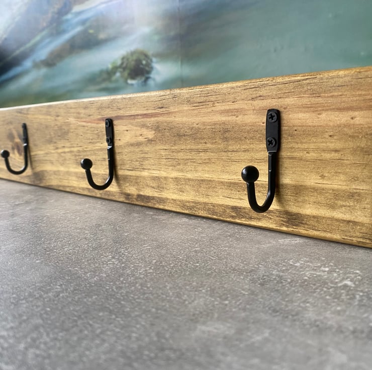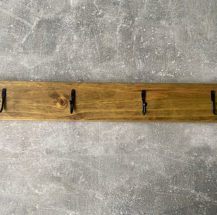 A rustic wooden coat rack made from reclaimed timber with a dark oak finish and 4 metal coat hooks. It has keyhole slots on the back so is ready to mount onto a wall. 50 cm long