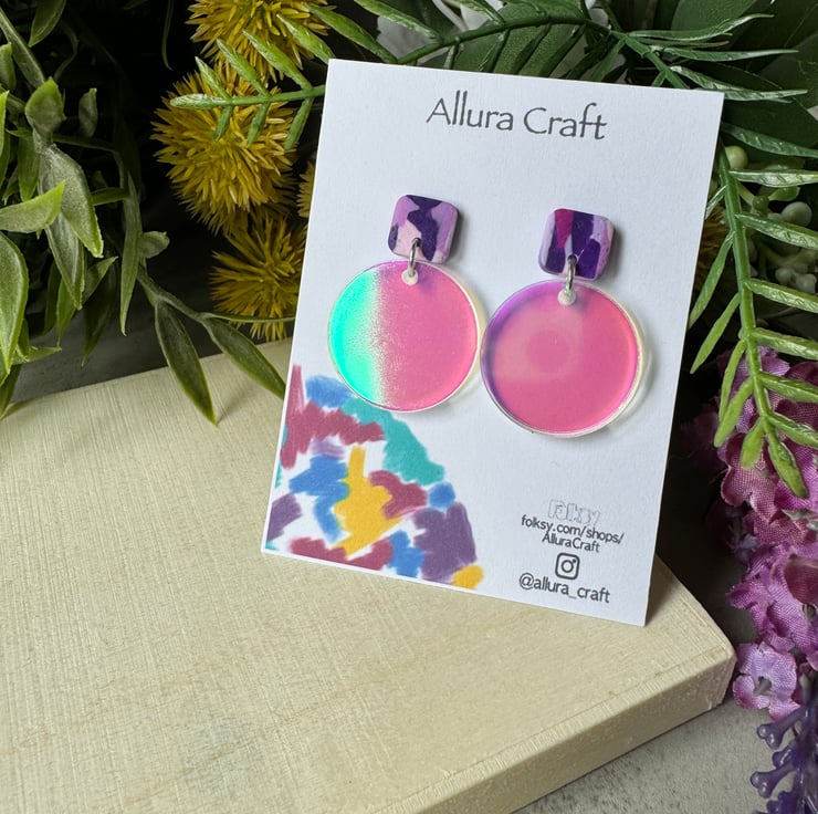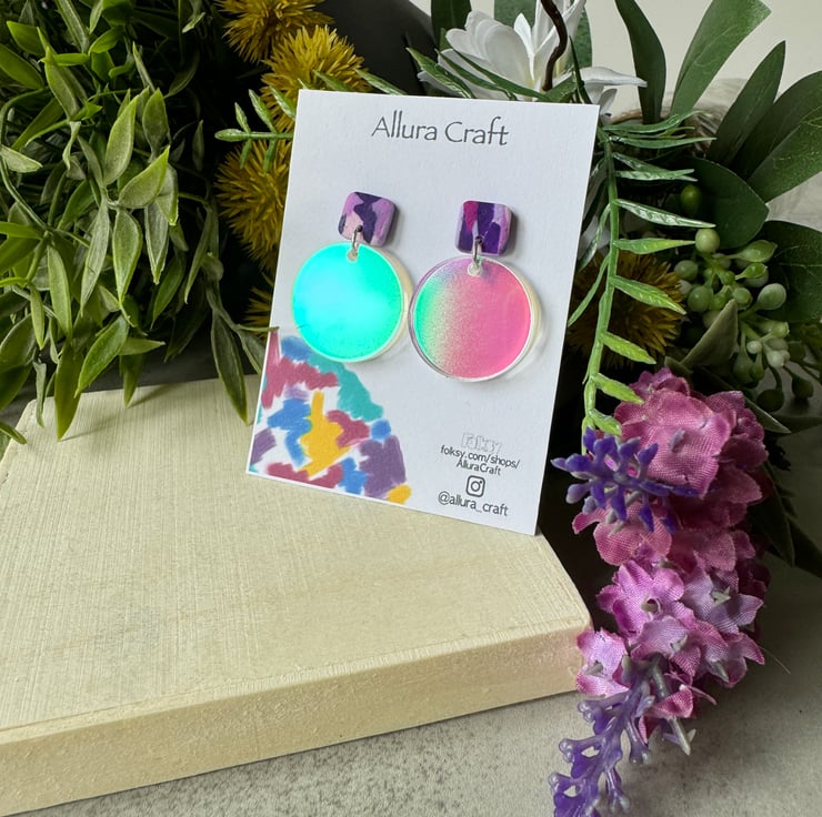 Attached to an a acrylic iridescent circle that omits hues of pinks, blue, green