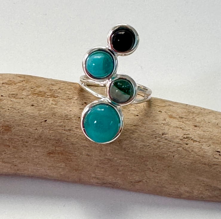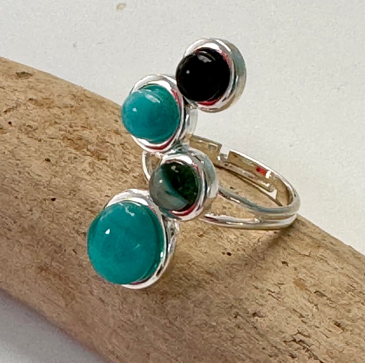 Stunning silver plated adjustable ring with hand made kiln formed glass cabochons , in lovely greens, turquoises and blue.