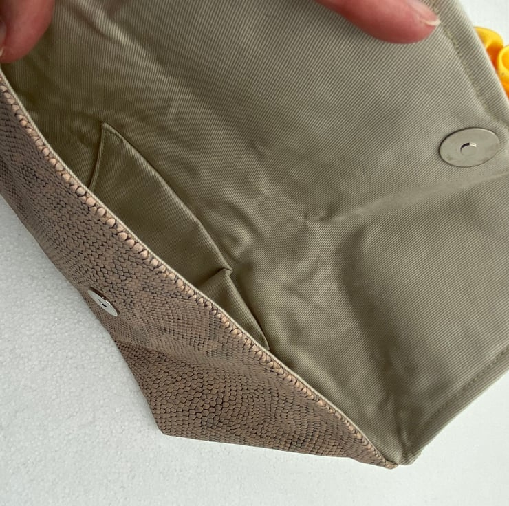 No.2 is a faux snakeskin bag in an unusual shape which measures 10” at the top and 7 1/2” at the bottom. I decorated the flap with a ribbon chrysanthemum and leaves in same snakeskin, fully lined it with an inside pocket and fastened it with a slimline magnetic fastener. This outer fabric can’t be ironed, the inner lining can be, carefully.