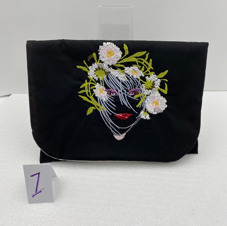 No. 1 is a black fabric clutch with an embroidered flap. This design is a Floral Fantasy design ( can you see her face )? The bag measures 9” x 7” has a flap to close and is fully lined with an inside pocket.