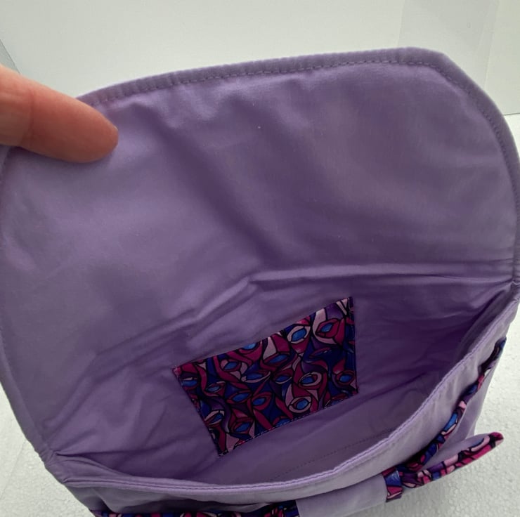 No.3 is a small clutch in lilac quilting cotton with a decorative bow strap, across the front which holds the flap in place. It measures 7 1/2” wide, 5” high and has a 2” base. It is fully lined with a contrasting slip pocket inside.