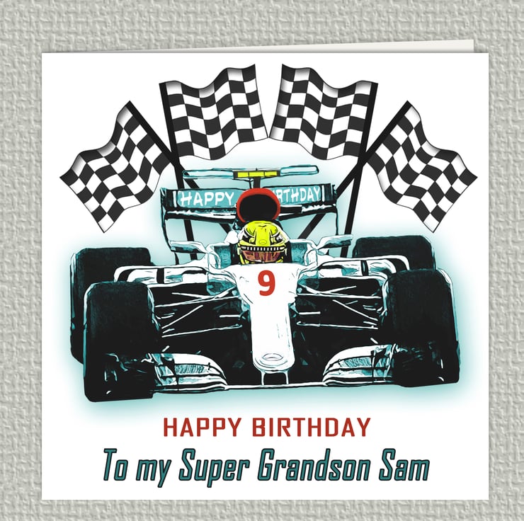 The perfect Birthday card for that special Formula 1 fan in your life! Based on the Mercedes F1 car of Sir Lewis Hamilton. A personalised card for son, daughter, grandson, brother, etc, etc.
