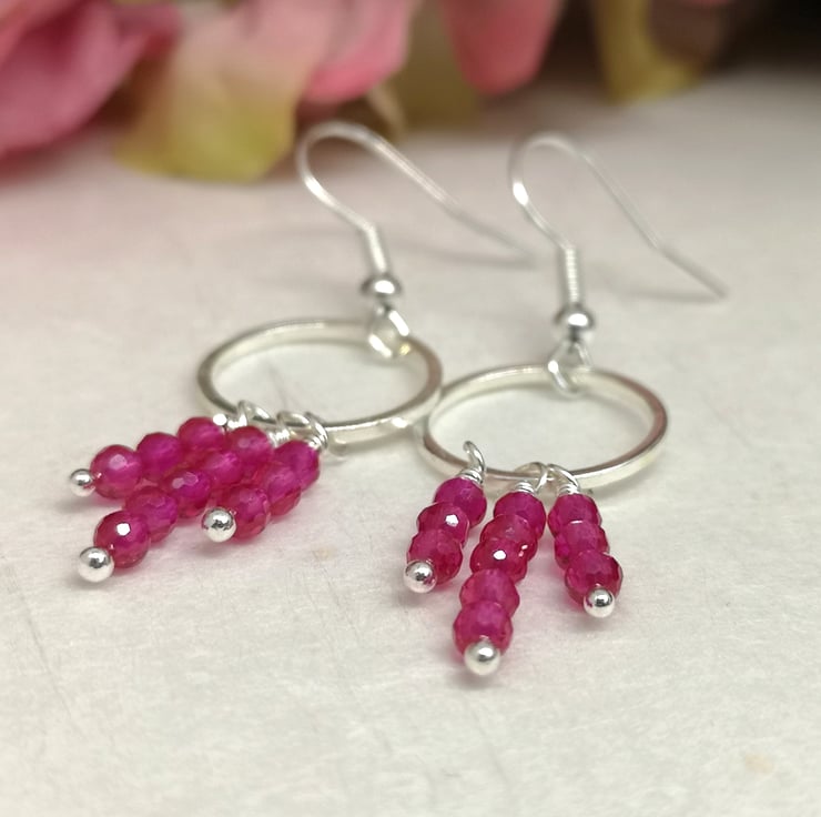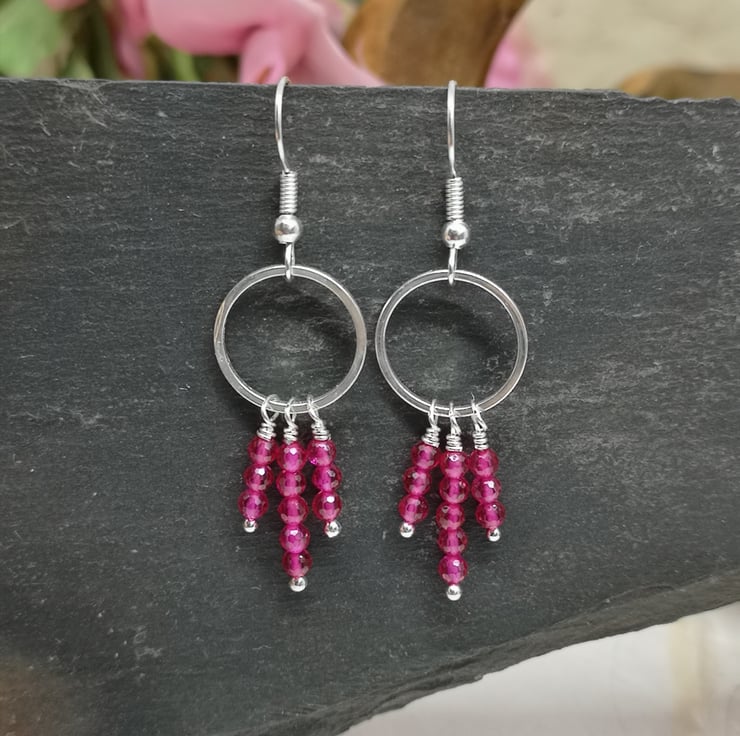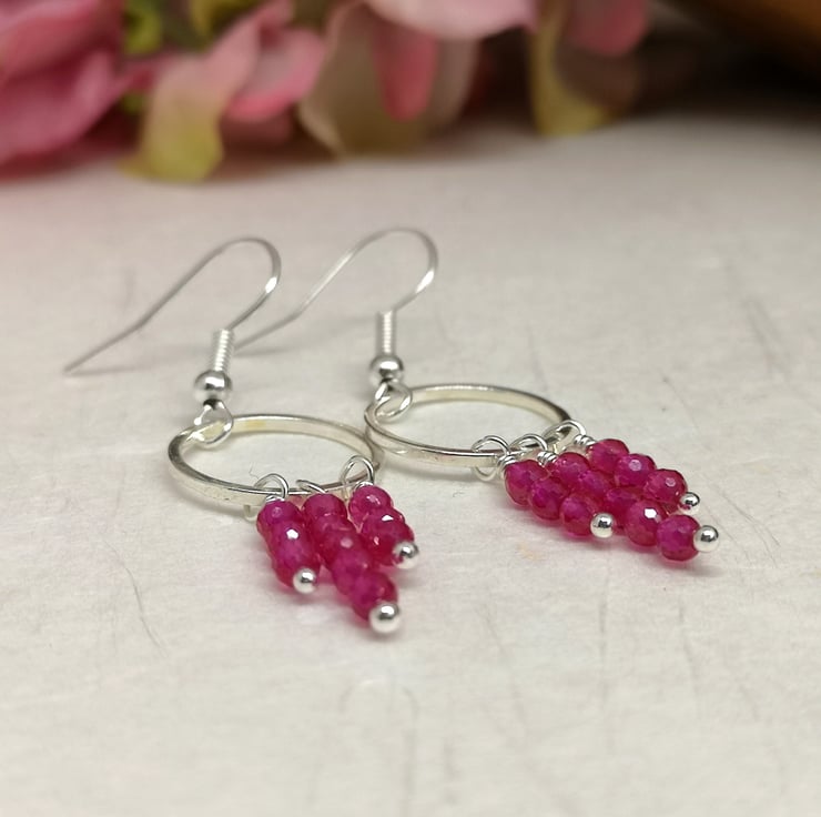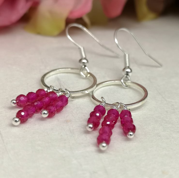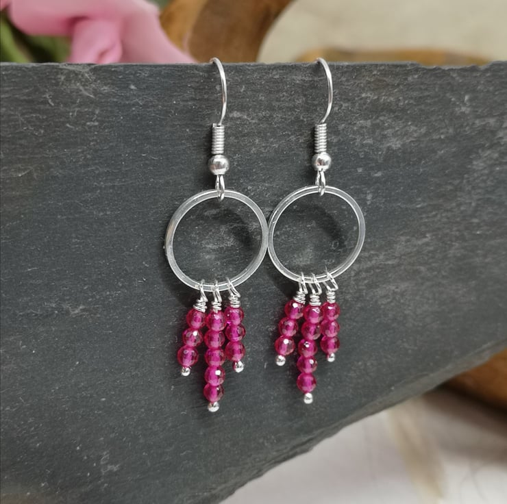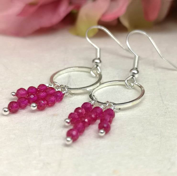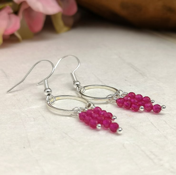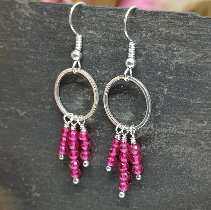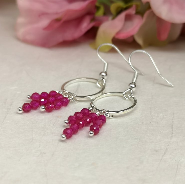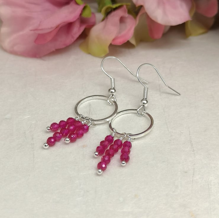 These earrings feature vibrant pink semi precious spinel beads, suspended from a silver plated ring and ear wires. The design allows for movement and encourages the facets to catch the light.