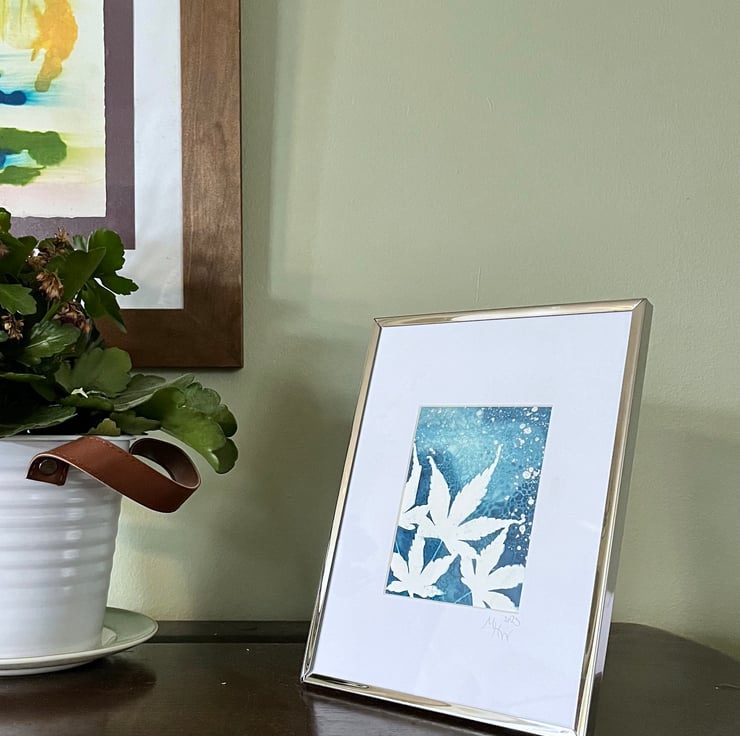 A lovingly handmade cyanotype with original and unique pressed flowers and leave. This particular piece has some metallic acrylic ink detail added for that extra sparkle and eye capturing beauty!