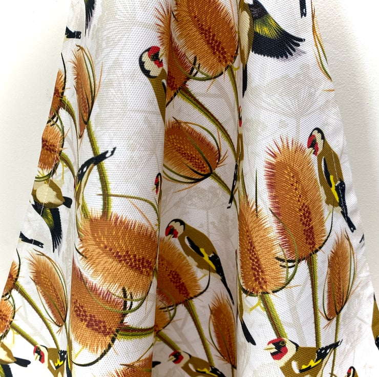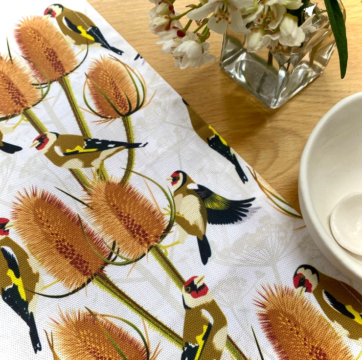 Beautiful Goldfinches feasting on teazle seed heads are featured on this 100% Cotton Tea Towel.
