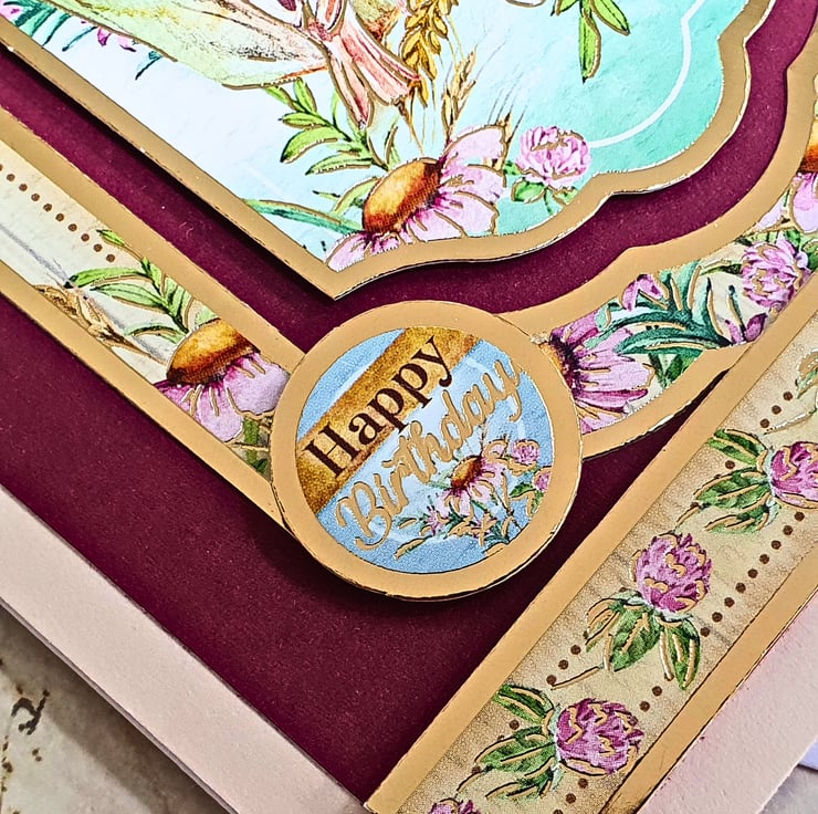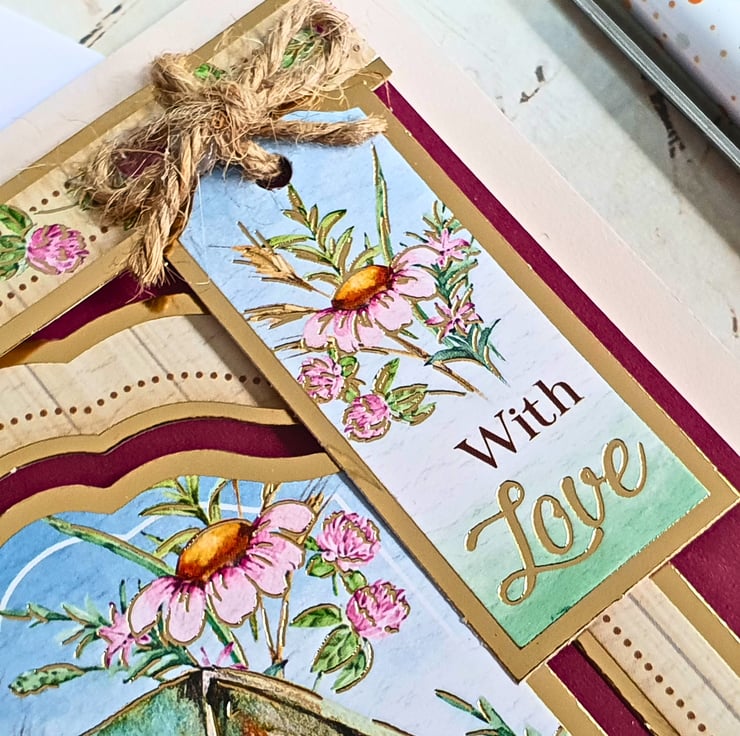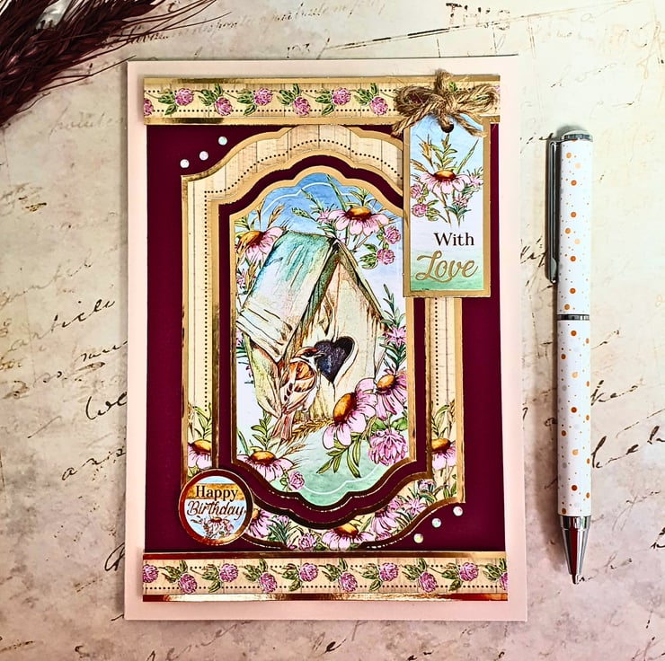 The main gold foiled topper in the middle of the card is surrounded by a matching frame, and it displays a very familiar picture of an English garden during the seasons of Spring & Summer; A Finch, standing outside its birdhouse, with lovely flowers all around! Two floral border strips decorate the top & bottom of the card, along with diamante gemstones. On the top right corner, a tag reads the sentiment "With Love" & is embellished with a bow made of natural twine. On the bottom left, there is a button tag with the wish "Happy Birthday".