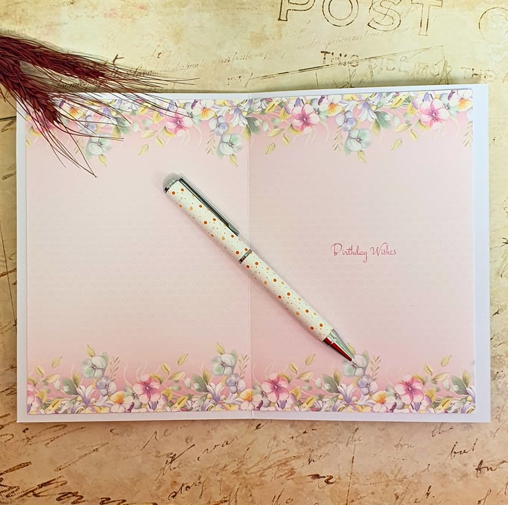 The card is finished with a double, coordinating insert of pearlescent paper, with the sentiment "Birthday Wishes" printed on the right page.