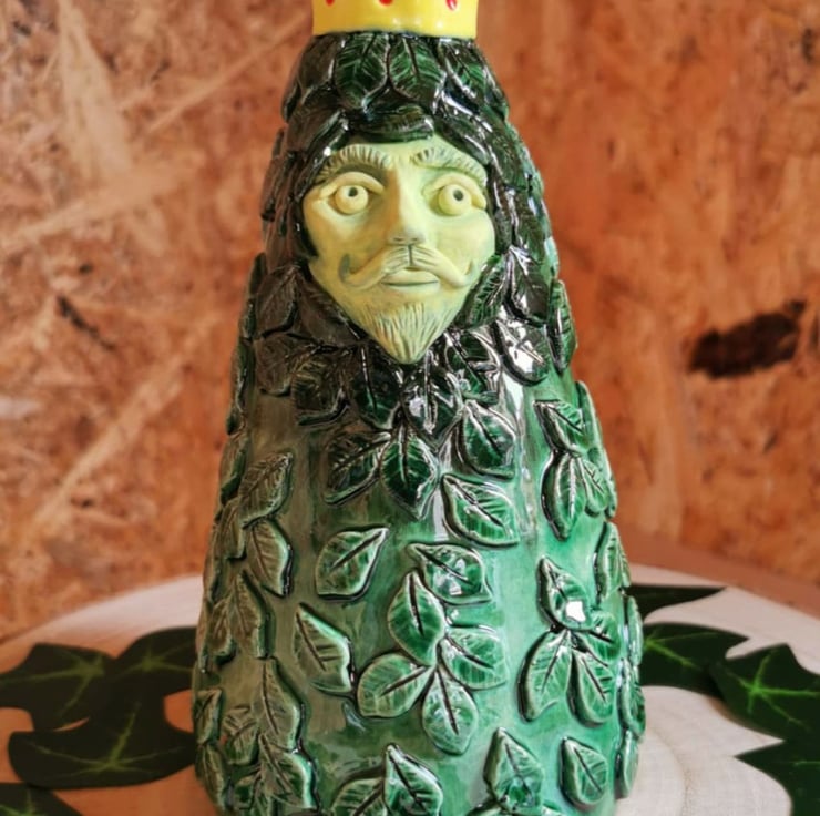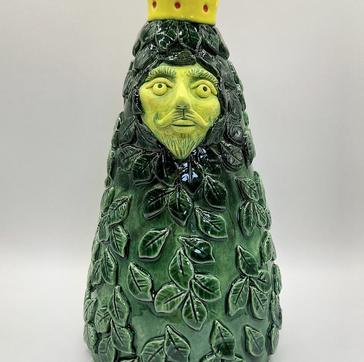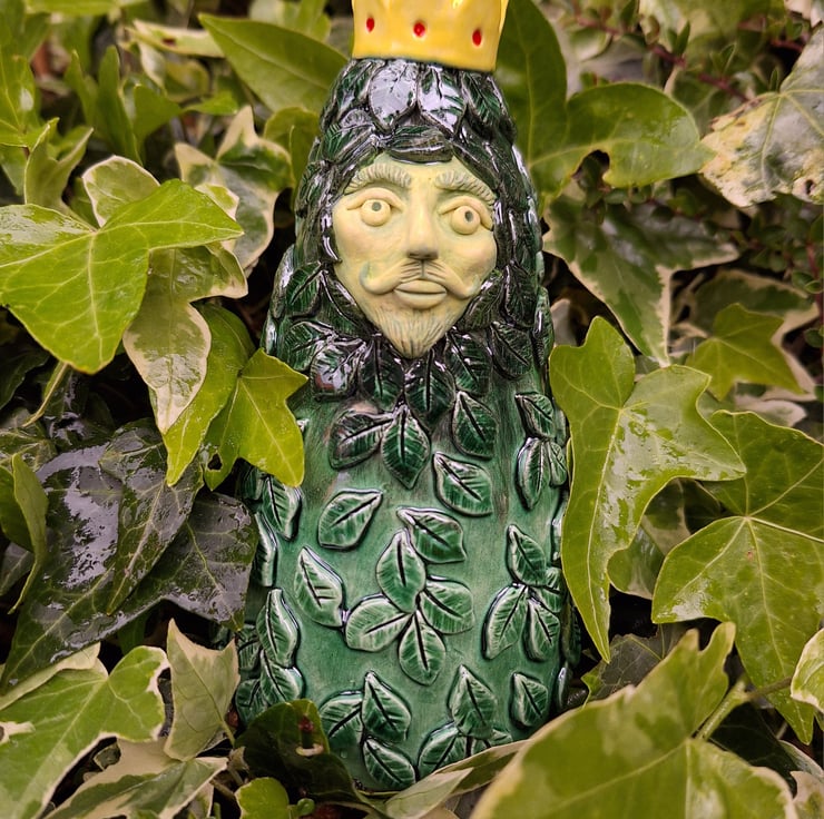 Handmade, earthenware ceramic Jack in the Green figurine. Jack is glazed with a matt finish to his face but with a beautiful glossy green coat of leaves and a regal crown!