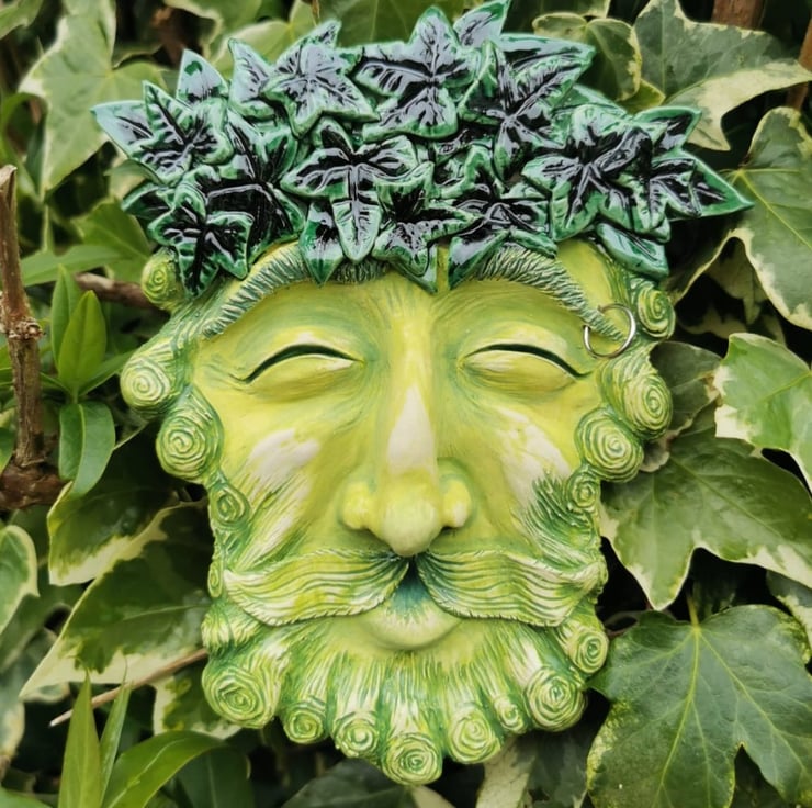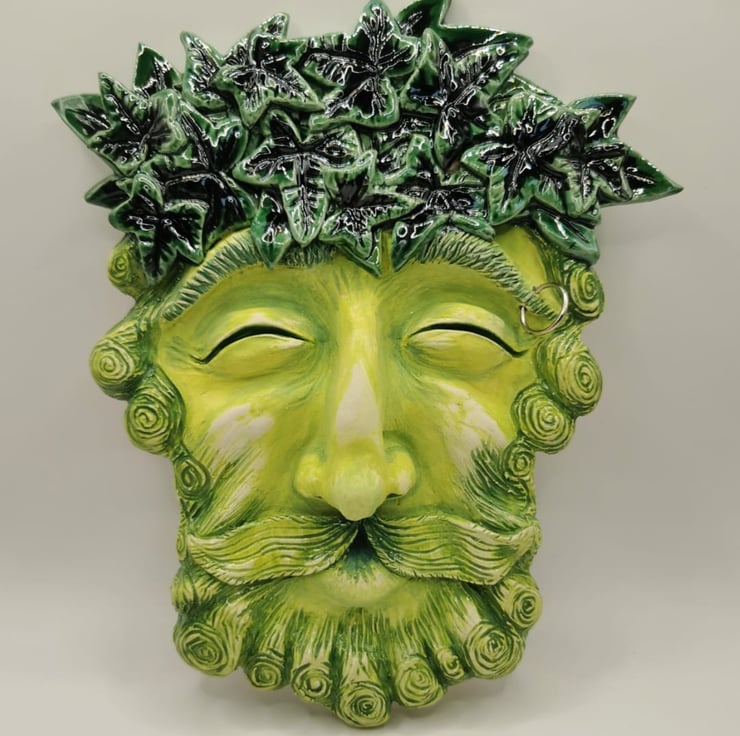 Bob is lovingly glazed to a matt finish but with a beautiful green glossy ivy crown. He also has a cheeky eyebrow ring! A wire hanger is on the back for hanging.