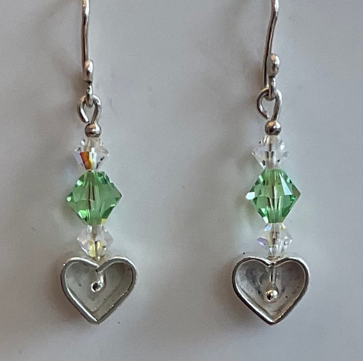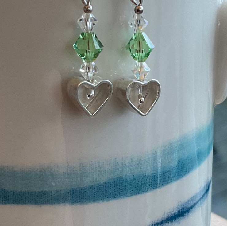 These delicate and elegant silver heart drop earrings will dazzle with their sweet design and sparkling green Swarovski bead (luckily source from a charity shop!). The hollow form design adds a lovely depth and structural feel.