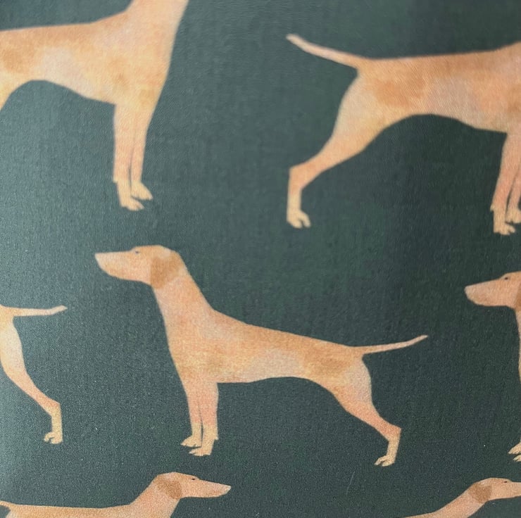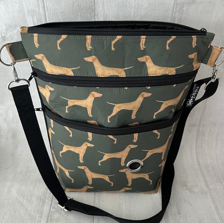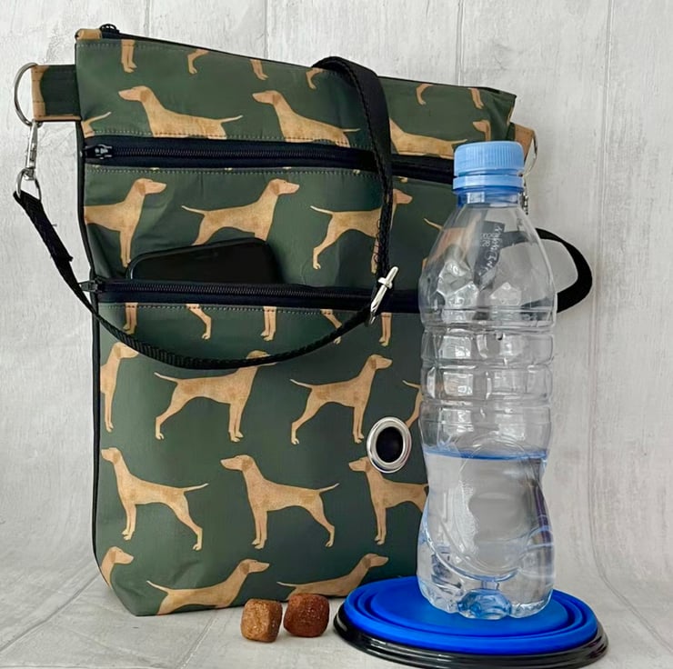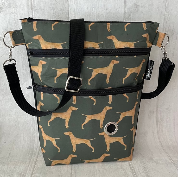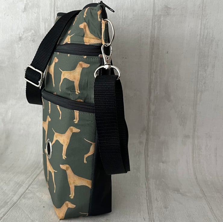 This vizsla cotton print cross body dog walking bag has a plain black waterproof nylon canvas back and is lined with a black waterproof nylon lining. This handy bag will hold all your essentials for walking your dog.