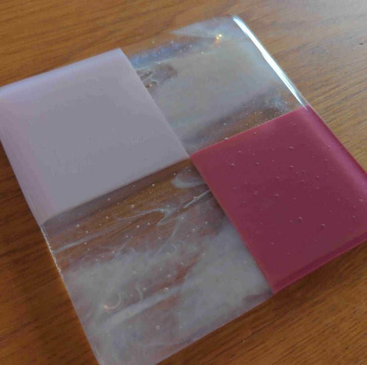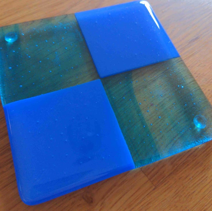Checkerboard fused glass coasters in a choice of gorgeous colours - transparent, streaky, opaque, glittery or metallic. A difficult choice!