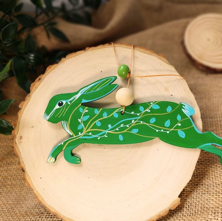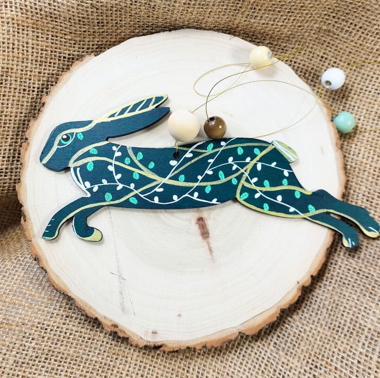 Beautiful wooden hanging hares hand painted on both sides with wooden beads on the cord. They can be hung from the ceiling, a window even from a shelf.