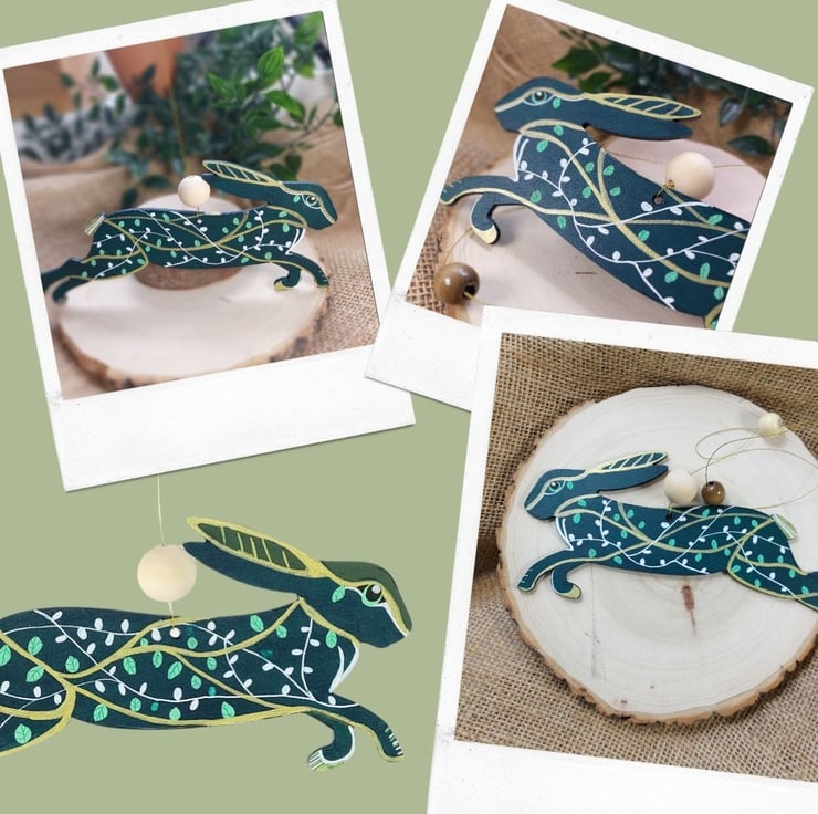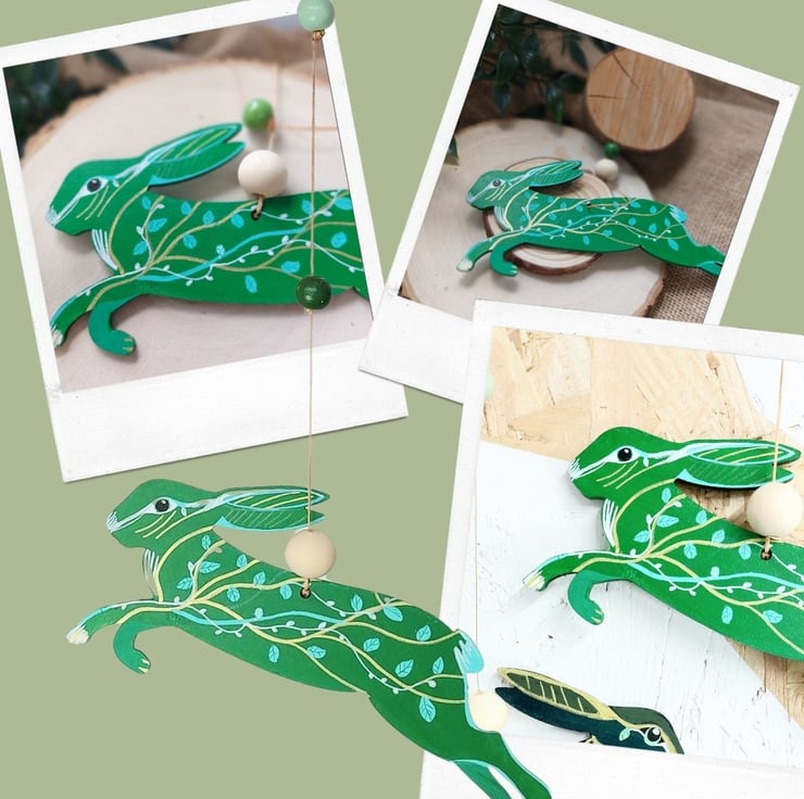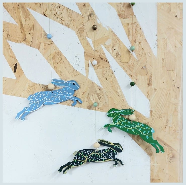 I have been wanting to create hanging decorations for a while and thought of bringing together bright colours with hares.