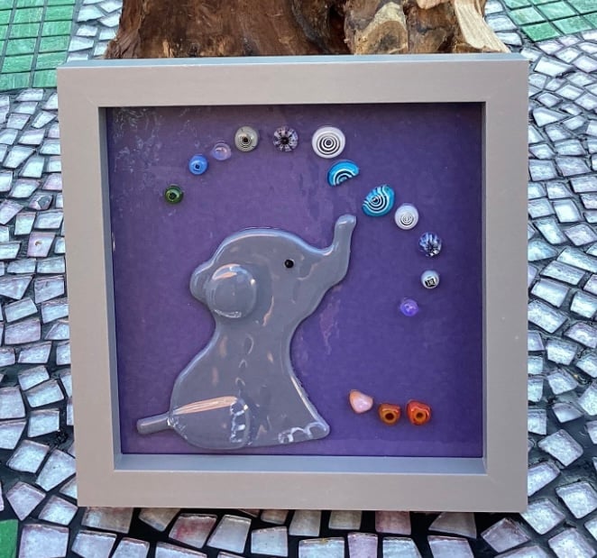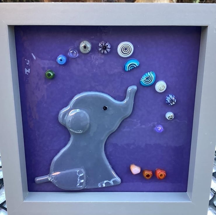 Handmade fused glass elephant blowing bubbles! This cute elephant was cut out in grey glass, then I added extra details before including murrini and some small glass hearts which are all mounted onto a background piece of lilac glass. This was then tack fused in the kiln. The finished piece is mounted in a square frame and measures 15cmx15cm.