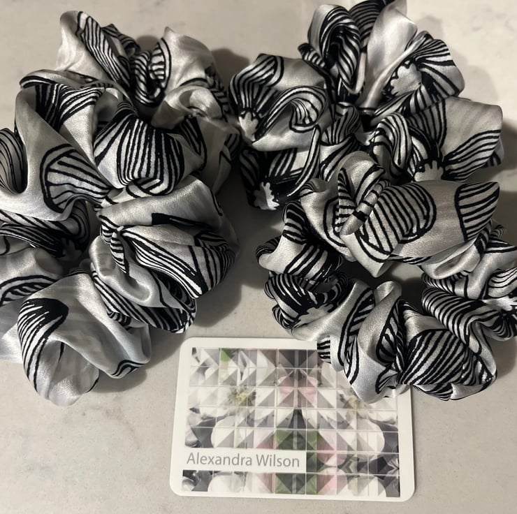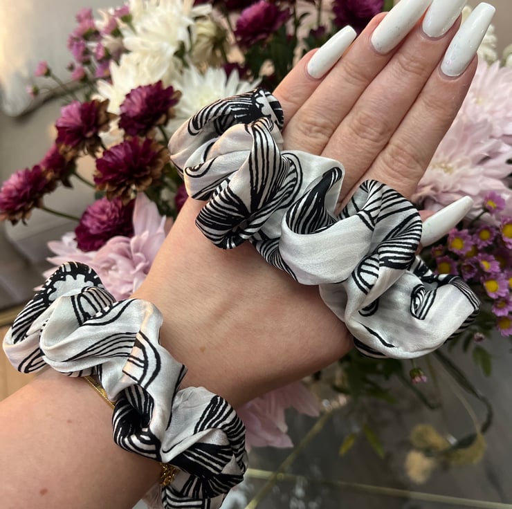 Introducing a set of four ‘doodle flower’ scrunchies that are perfect for adding a touch of elegance to any hairstyle. These scrunchies are made from high-quality, pure silk material that is both durable and soft. The set includes 4 scrunchies in various sizes.