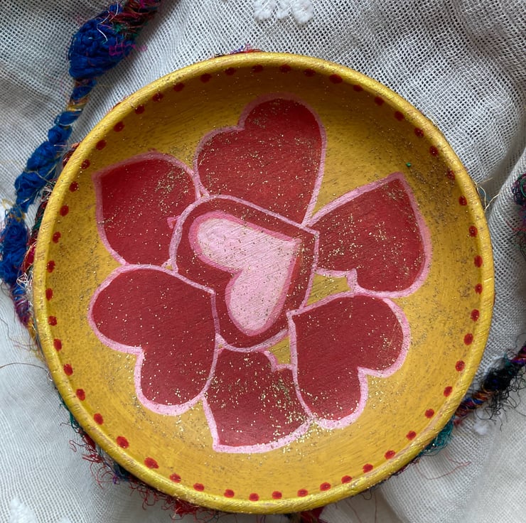 This little wooden dish is another wee rescue which has been cleaned up and hand painted mainly in ochre colour.