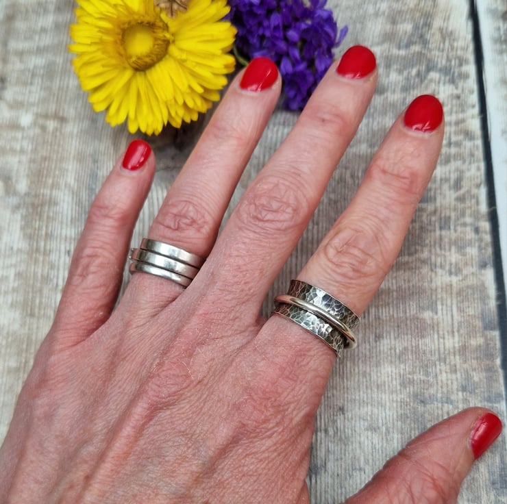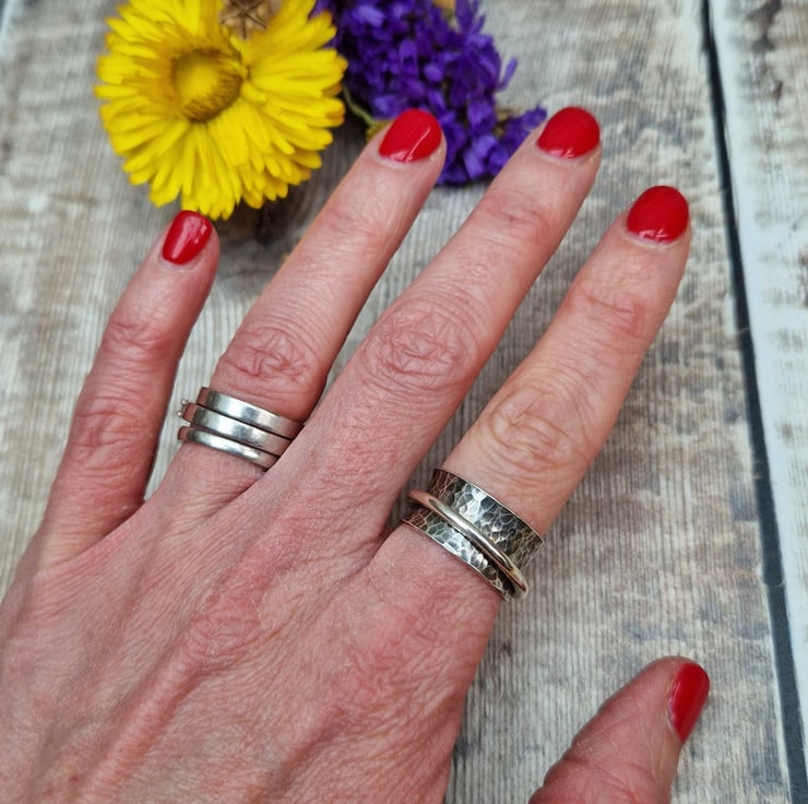 This handmade sterling silver spinner ring features a beautifully hammered, oxidised band with a polished silver spinner that glides effortlessly around the ring. The contrast between the darkened, textured base and the smooth, shining spinner creates a dynamic balance of rustic and refined. Crafted in Bristol, UK, from recycled sterling silver, the ring’s wide band and tactile design make it both visually striking and incredibly comfortable to wear.