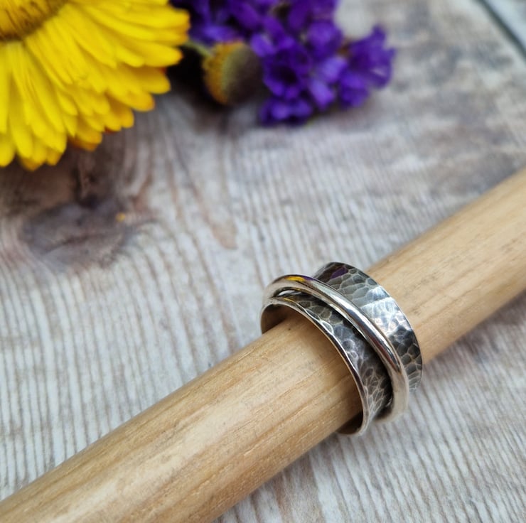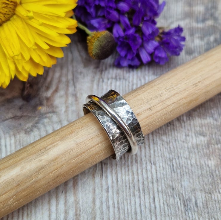 Recycled Sterling Silver Hammered Oxidised Spinner Ring - UK Size M