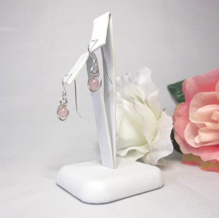 The Rose Quartz gemstone bead measures 6 mm in diameter & the outer silver ring 8 mm in diameter. The recycled silver handmade ear wires are designed to be comfortable and secure. The overall drop from the ear wire is approximately 12 mm.
