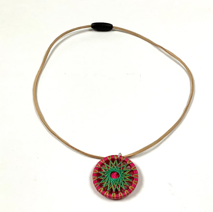 This pendant has been made by winding Cotton Perle thread around a metal ring to make intricate designs. They are known as Zwirnknopfe buttons, similar to Dorset Buttons but constructed differently. The necklace is very light to wear.
