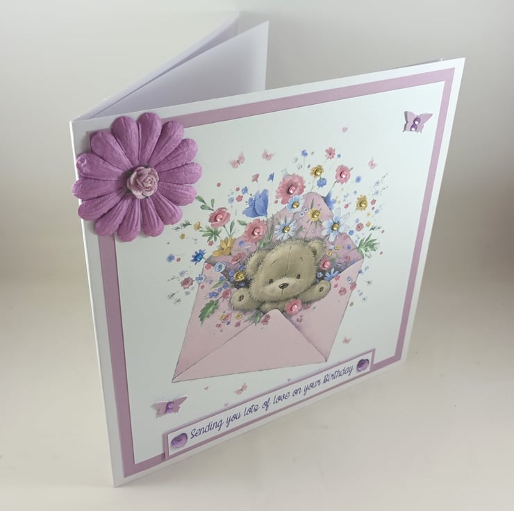 Large square birthday card featuring a printed image of a cute bear and lots of flowers bursting out of an envelope. The centres of the largest flowers have been embellished with adhesive gems and the card has been further embellished with die cut butterflies and paper flowers. The sentiment reads: 'Sending you lots of love on your Birthday.'