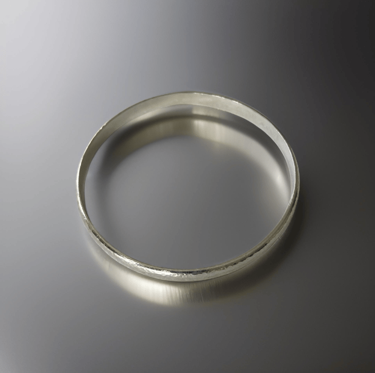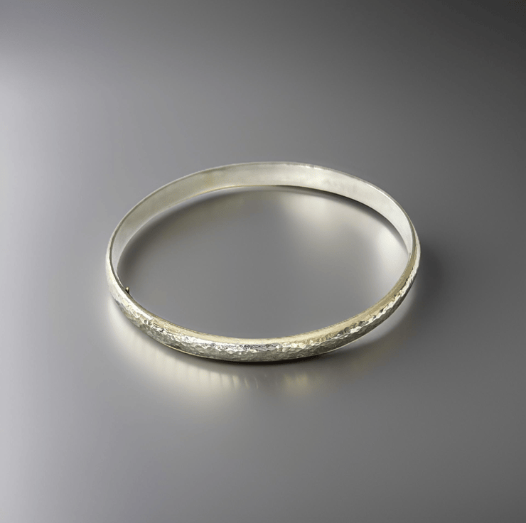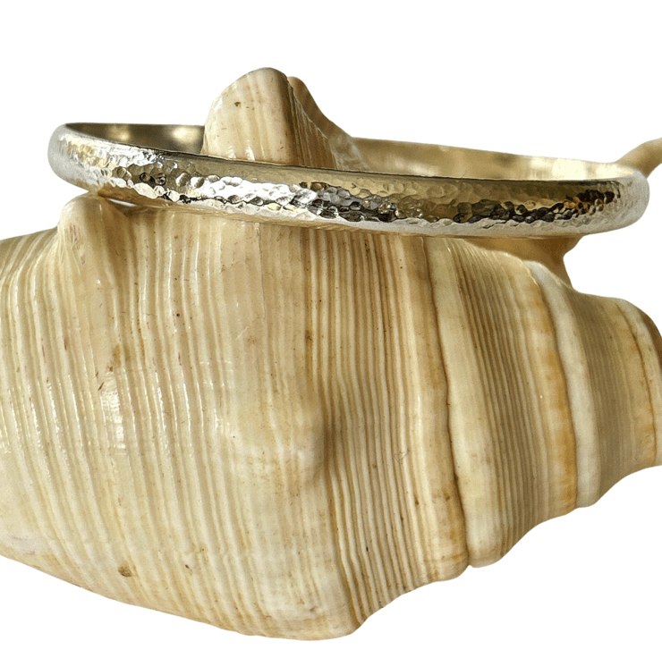This stunning bangle features a bohemian design and is crafted from solid sterling silver.It is made using eco-friendly and recycled materials, highlighting its artisanal qualities. The hammered rustic finish adds to its charm, while its 6mm width and 2mm thickness makes this bangle a sustainable piece. Perfect for everyday wear, this bangle is lovingly handmade to order in my Woolacombe studio in North Devon.