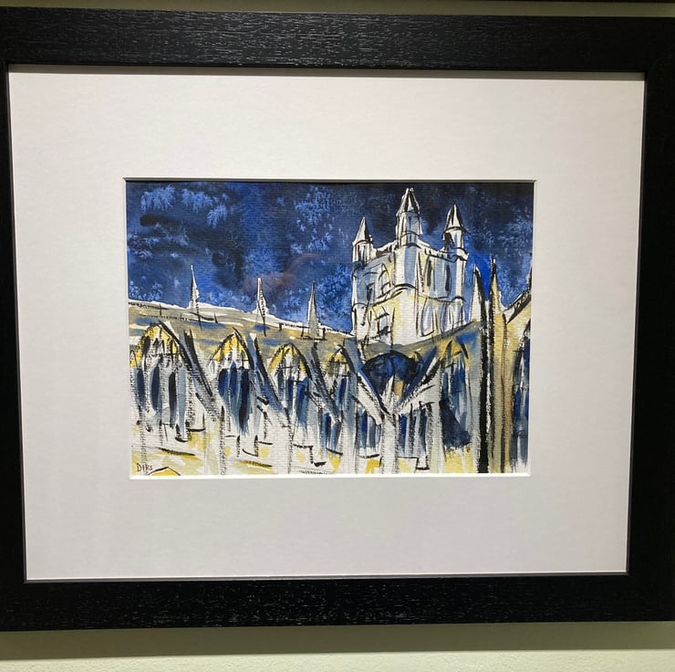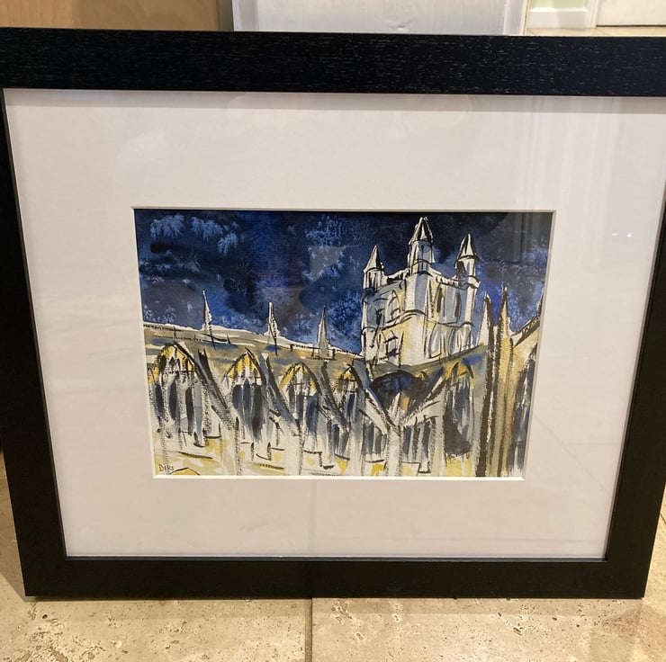 An original watercolour painting of Bath Abbey on a snowy night, signed by the artist. Presented in an attractive black woodgrain frame with acrylic glass and a white mount. Approx. dimensions: frame 48cmx40cm; image 26cmx19cm.