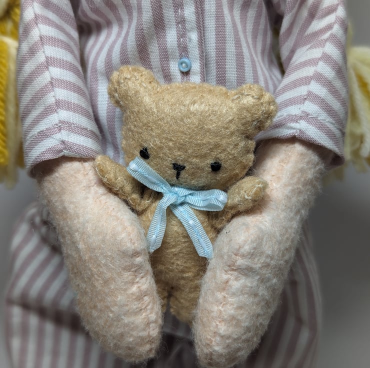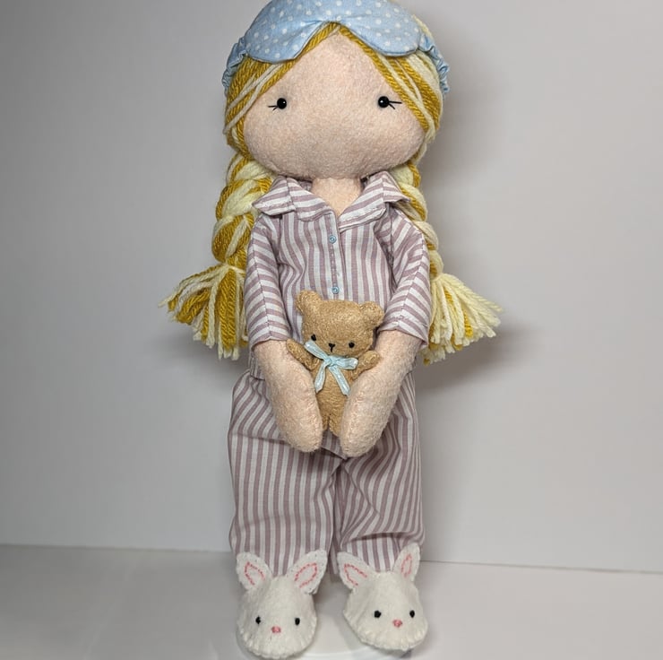 She is a unique handmade felt dolly, wearing her cute pyjamas and bunny slippers. She also has her tiny teddy companion.
