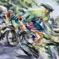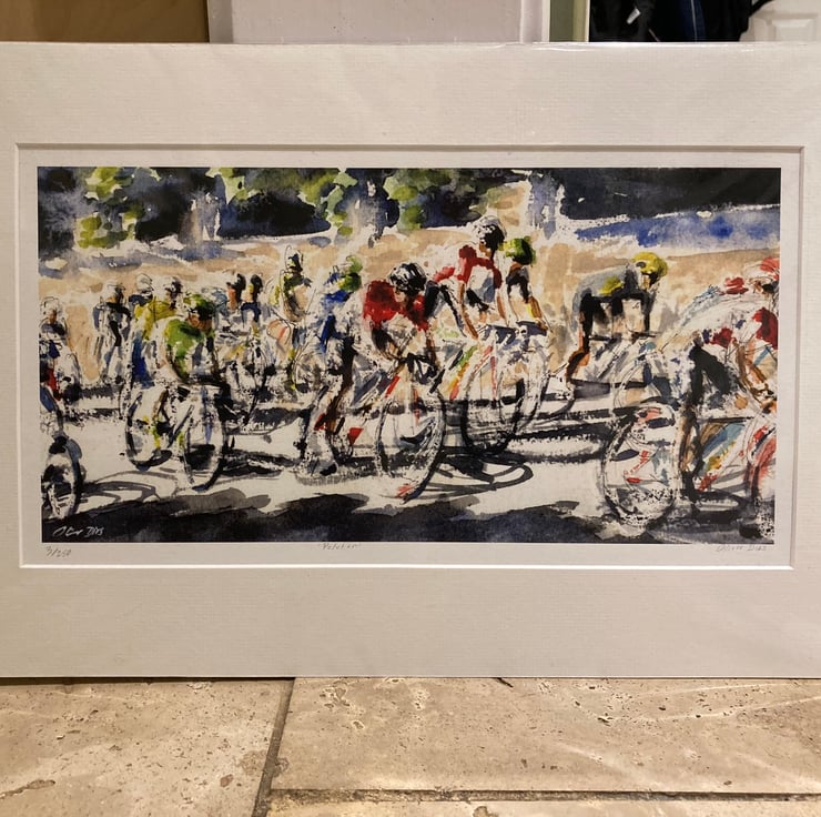 A limited edition giclée print of a watercolour painting of the Bath stage of the Tour of Britain cycling race, signed and numbered by the artist. Printed on high-quality water colour-type paper and presented on an attractive cream-coloured mount. UNFRAMED. Approx. dimensions: mount 51cmx34cm; image 38cmx21cm. (Note that one of the photographs shows the print in plastic wrapping).