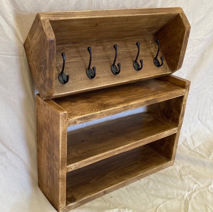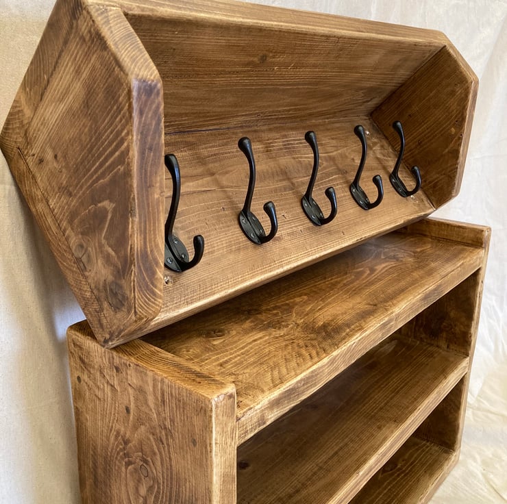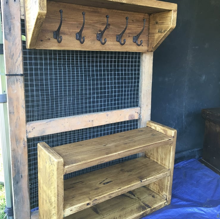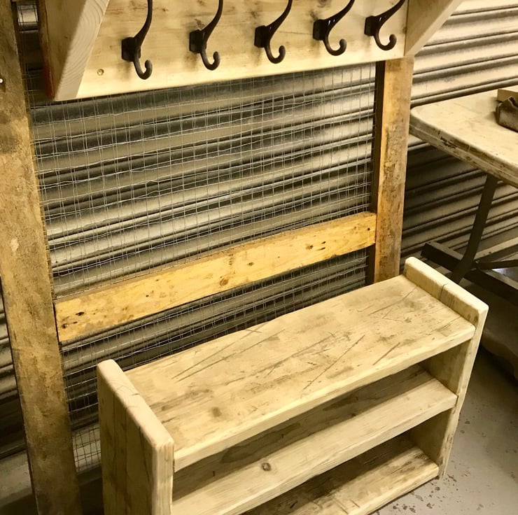 Matching rustic coat rack and shoe rack set, handmade from reclaimed wood.