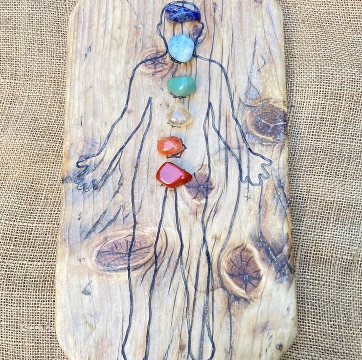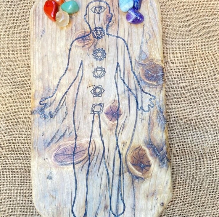 This rustic reiki board is handmade from salvaged wood, with a natural finish and design that is pyrographed by hand.