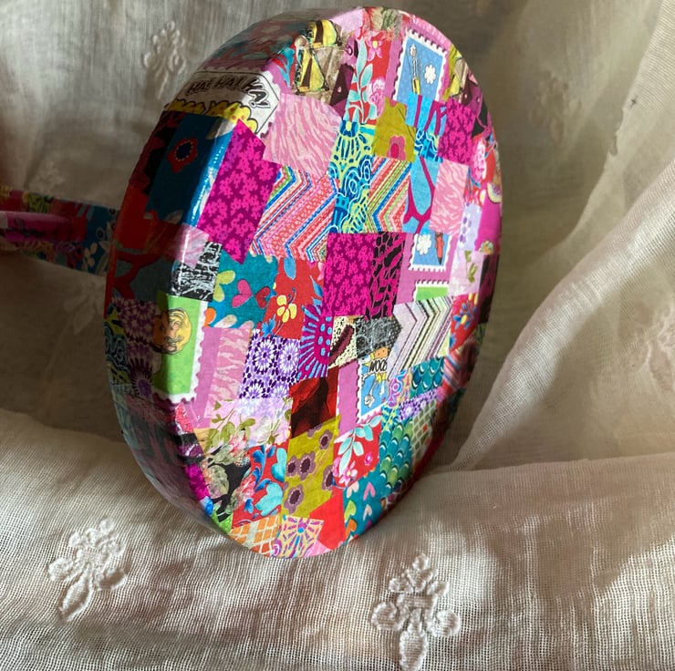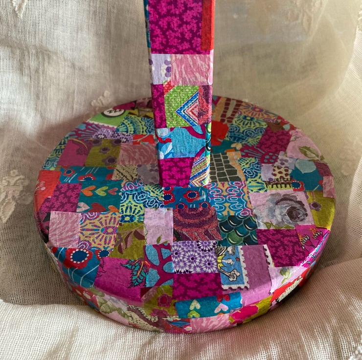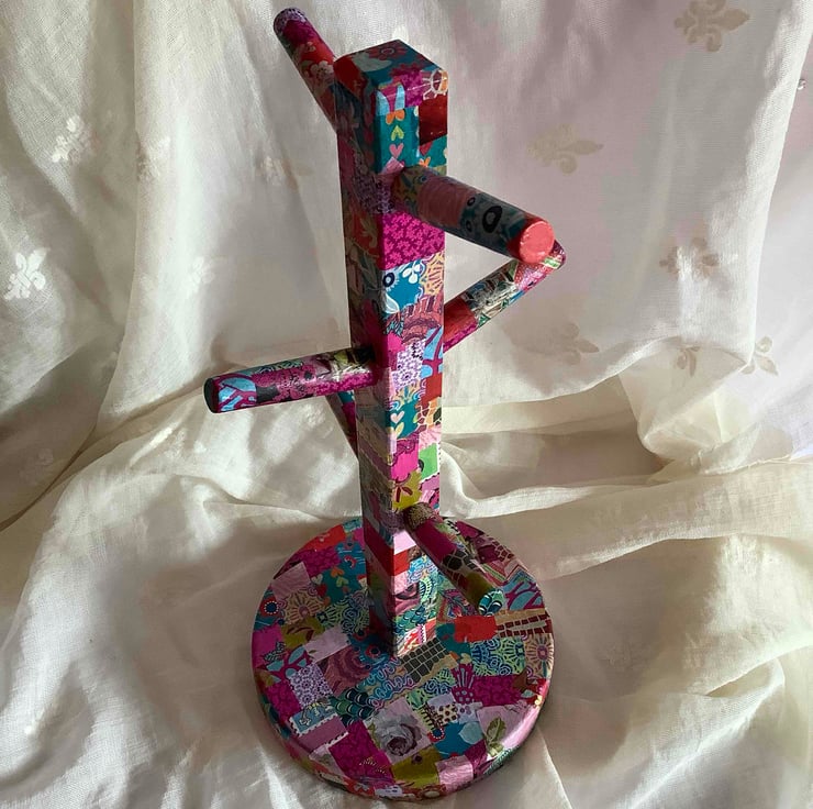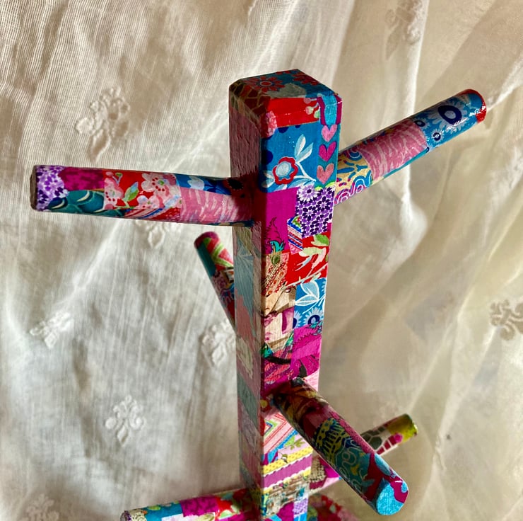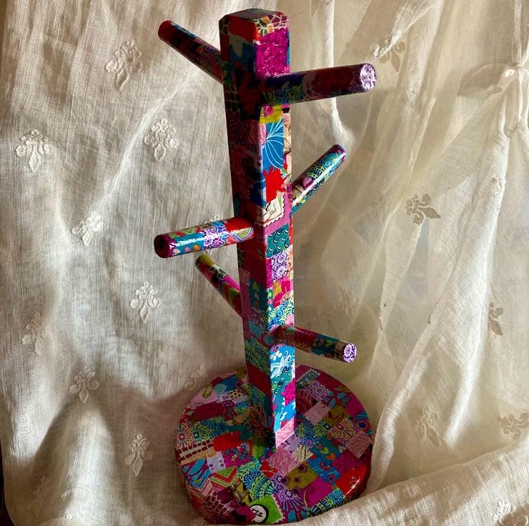 This wooden mug tree has been rescued and cleaned before being decopatched in a variety of bright and cheery colours