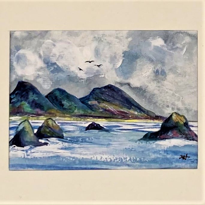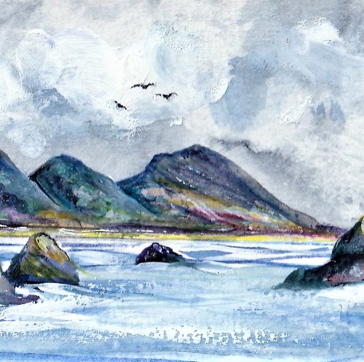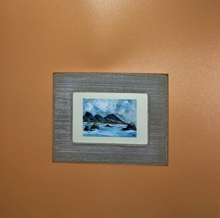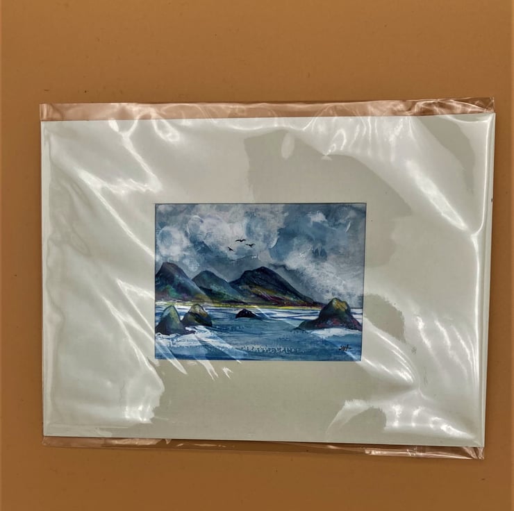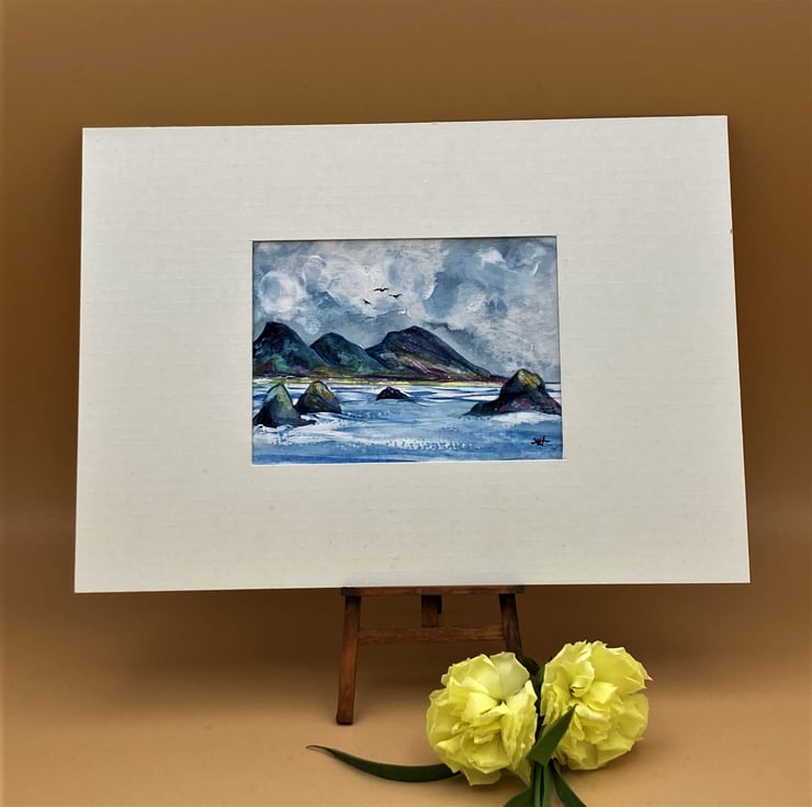 This Watercolour seascape is an original ACEO painted by me. ACEO's are tiny & measure 3.5" x 2.5". This painting shows waves swirling against rocks, with mountains, seagulls and storm clouds in the background. I think it catches the essence of a cold sea under turbulent skies when the barometer is falling & a nasty squall could be on its way.