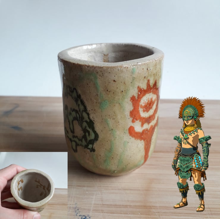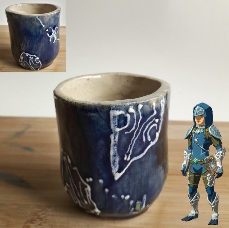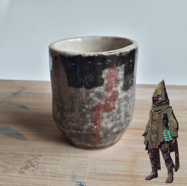 For sale is a ceramic cup, inspired by the armour from one of my favourite games, Tears of the Kingdom. Each cup draws inspiration from the different garments in the game: the mystic armour and accompanying blupee; the armour of the feathered Rito; the aquatic Zora; the gloomy armour of the Depths; and the luminous green and red of the Zonai. When ordering, please specify which cup you would like in the notes section or just message me :-)