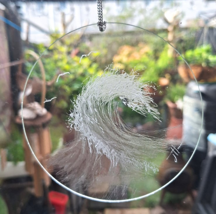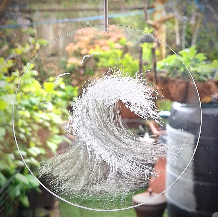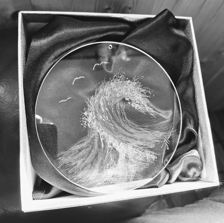 Hand engraved with the image of a crashing wave My engravings are comprised of thousands of tiny scratches by a diamond point which trap the light to reveal the vision in the glass I think it is particularly effective on a window hanging and as the image is cut into the glass it is permanent. The image can not be washed away ,it will always look as you see it on the day you receive it.