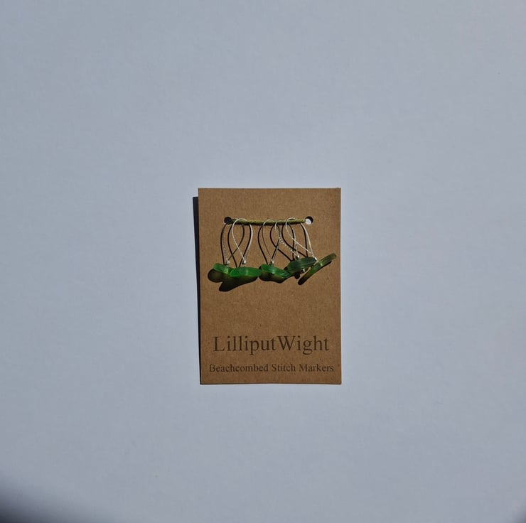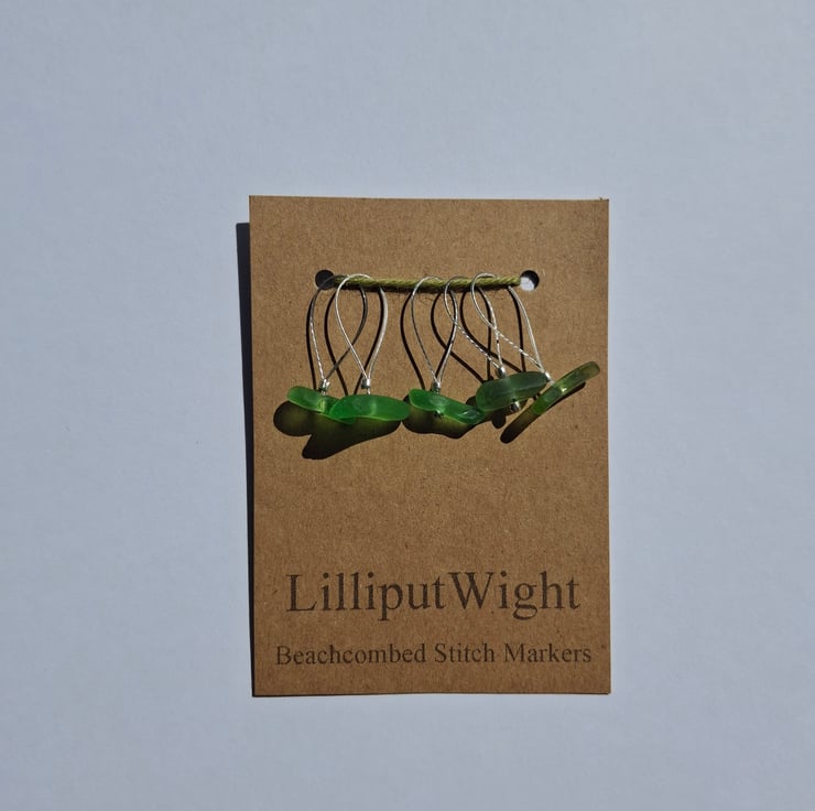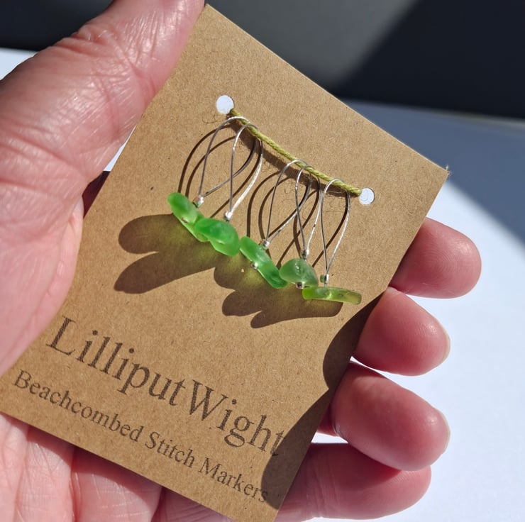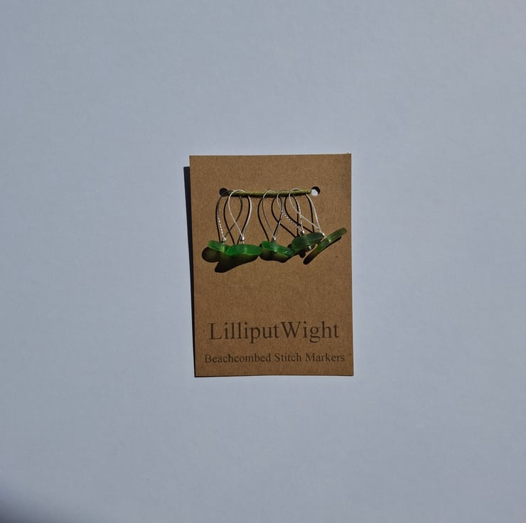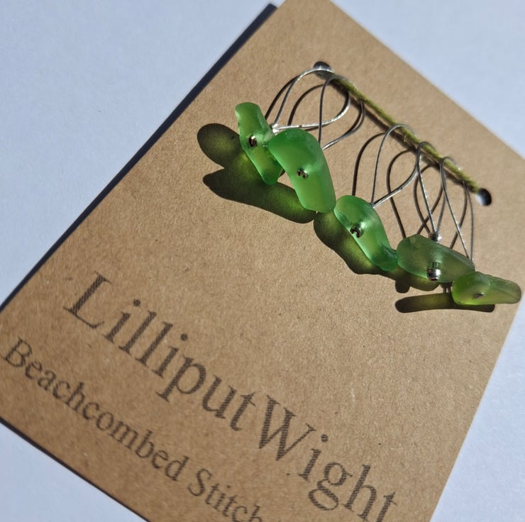 A set of five sea glass stitch markers in shades of green. The sea glass is all genuine and has been collected from beaches close to my home on the Isle of Wight.
