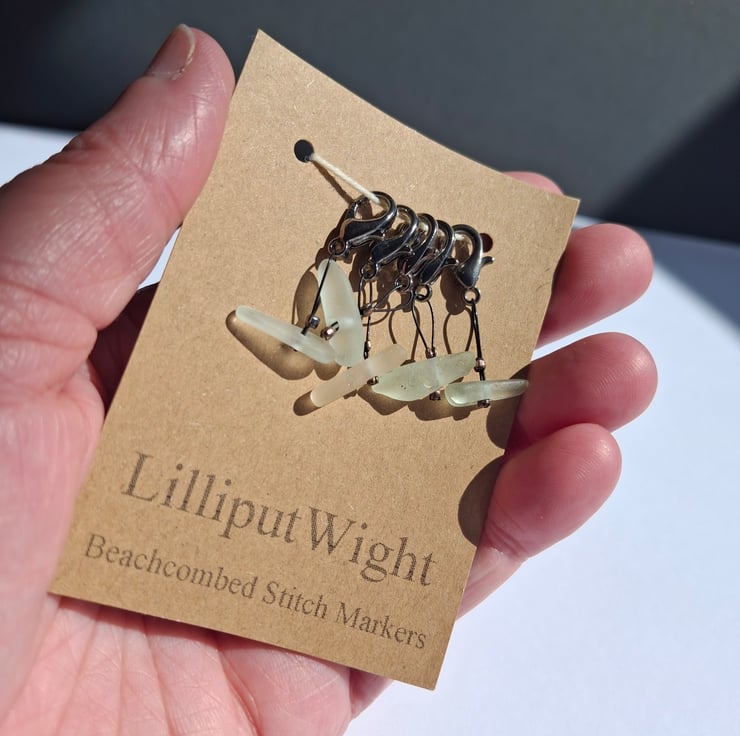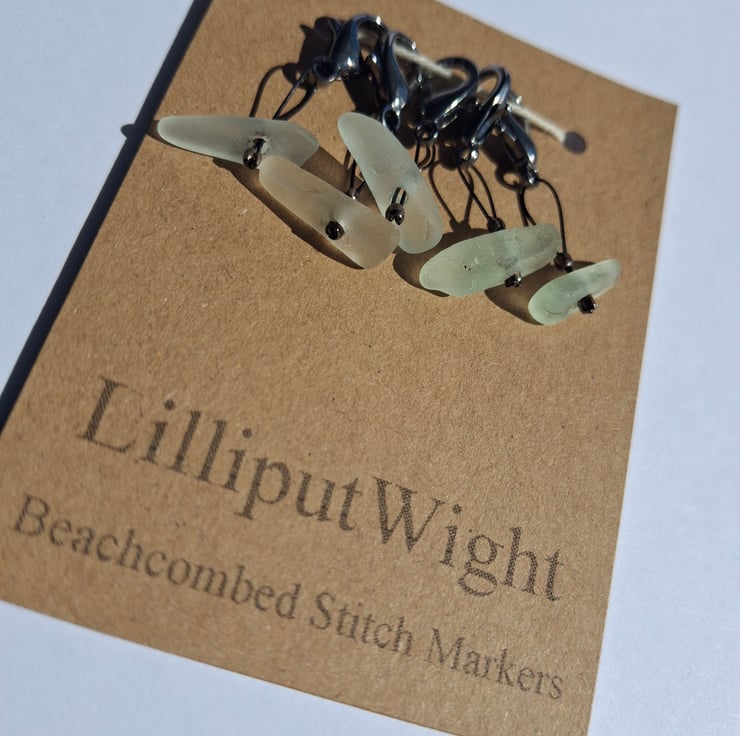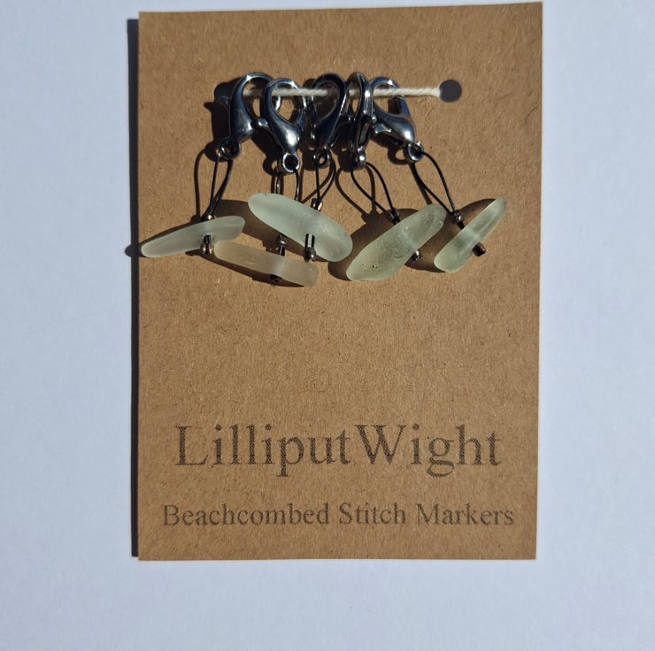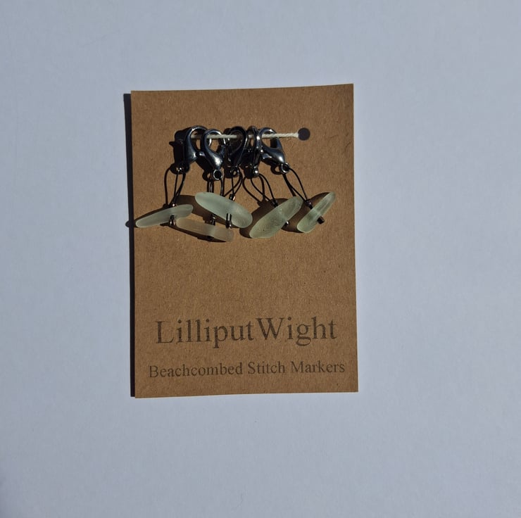 A set of five sea glass stitch markers in shades of sea foam. The sea glass is all genuine and has been collected from beaches close to my home on the Isle of Wight.