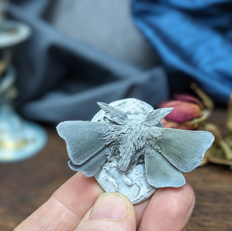 A one off Moth sculpture made from a variety of different materials including cardboard, polyfiller, polymer clay and oil paint. Each one is hand made and then painted.