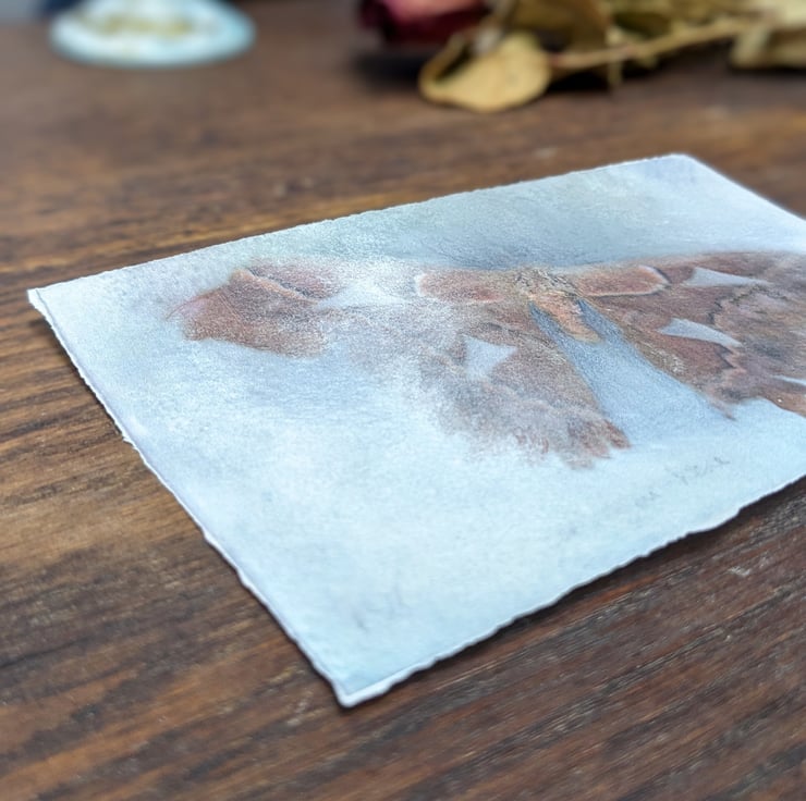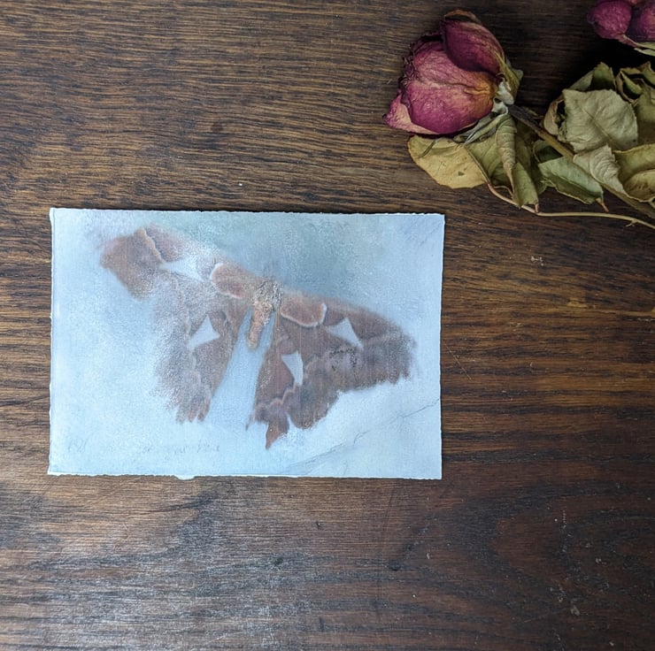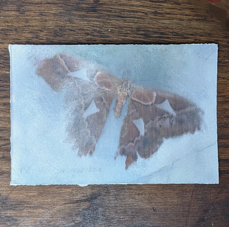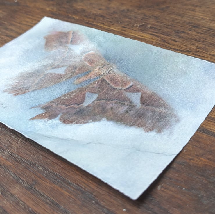 This technique uses both traditional media and the use of a colour photocopier to create the final image. A background is created on a piece of paper using watercolour and pastel, it is then placed in the photocopier on top of real moths, and photocopied. The print out from that is then manipulated with pastel, pencil and watercolour. The process is repeated several times. The last print out has one final layer of pastel added.