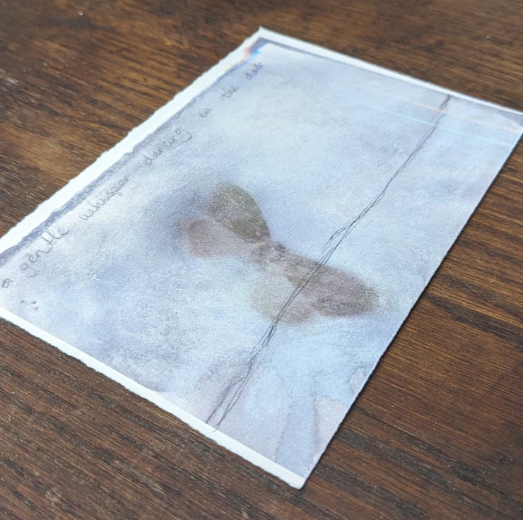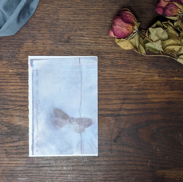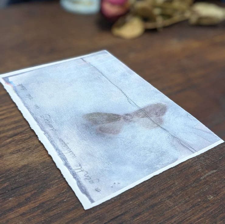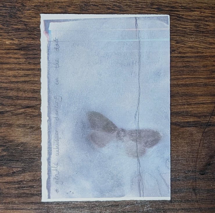 This technique uses both traditional media and the use of a colour photocopier to create the final image. A background is created on a piece of paper using watercolour and pastel, it is then placed in the photocopier on top of real moths, and photocopied. The print out from that is then manipulated with pastel, pencil and watercolour. The process is repeated several times. The last print out has one final layer of pastel added.