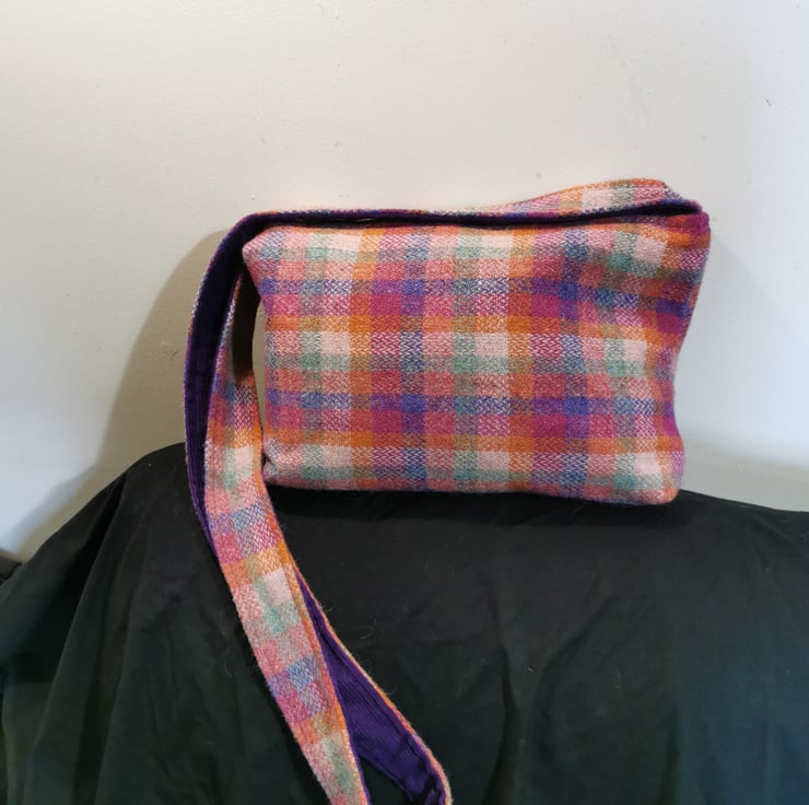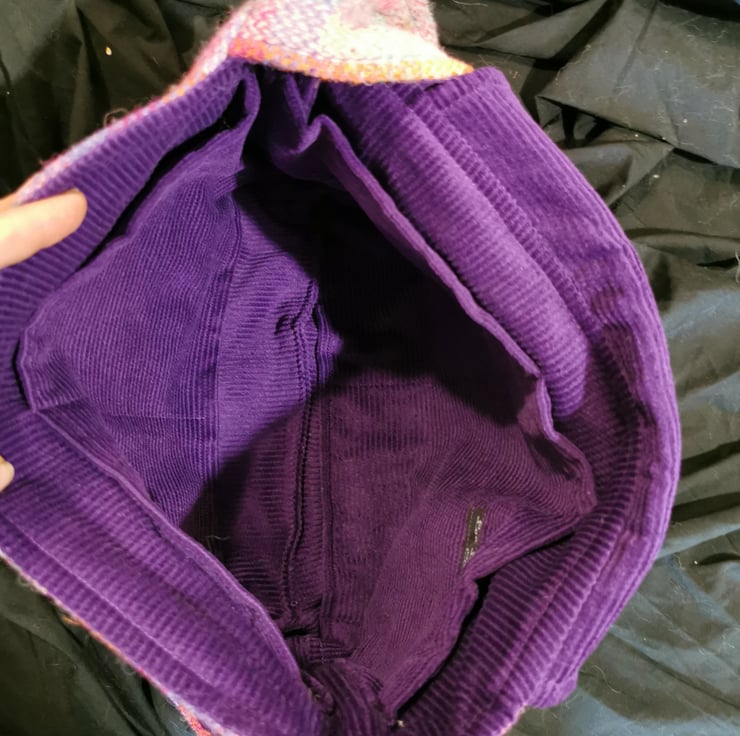 This is a medium/large bag that is lined with corduroy and has 4 internal pockets (big enough for a mobile phone)