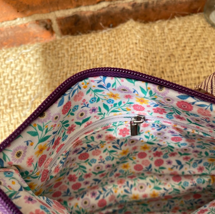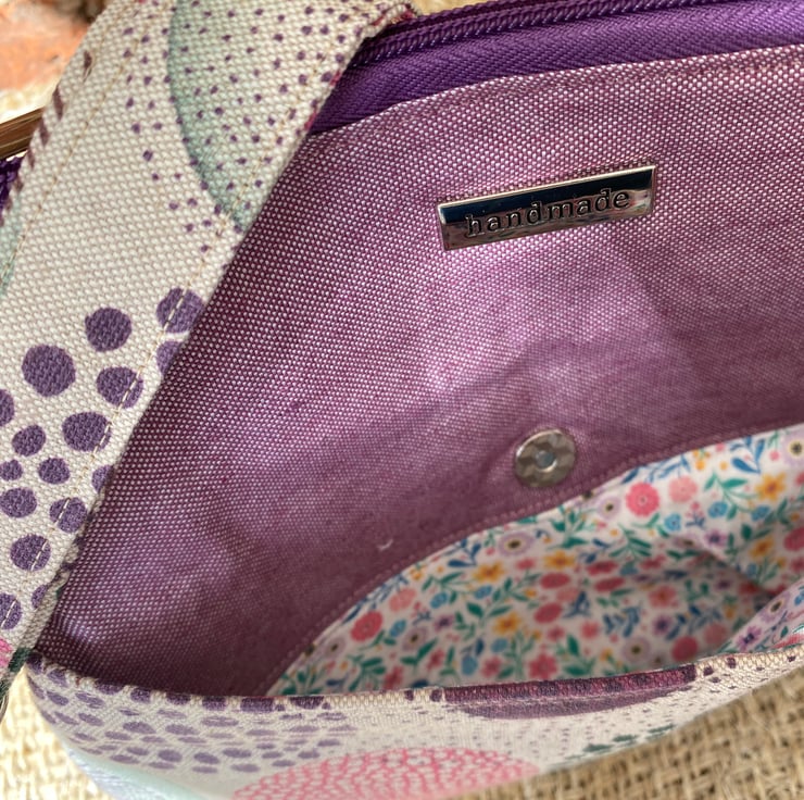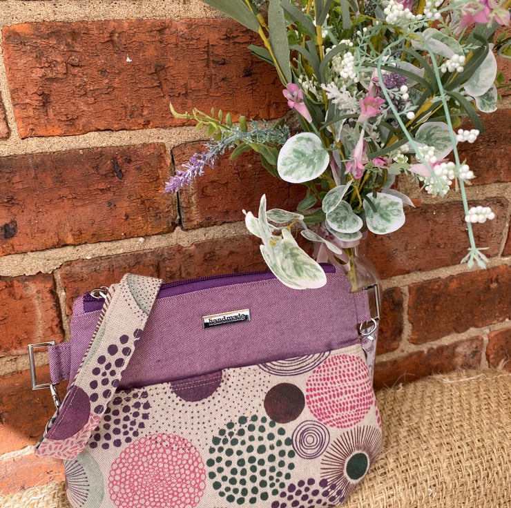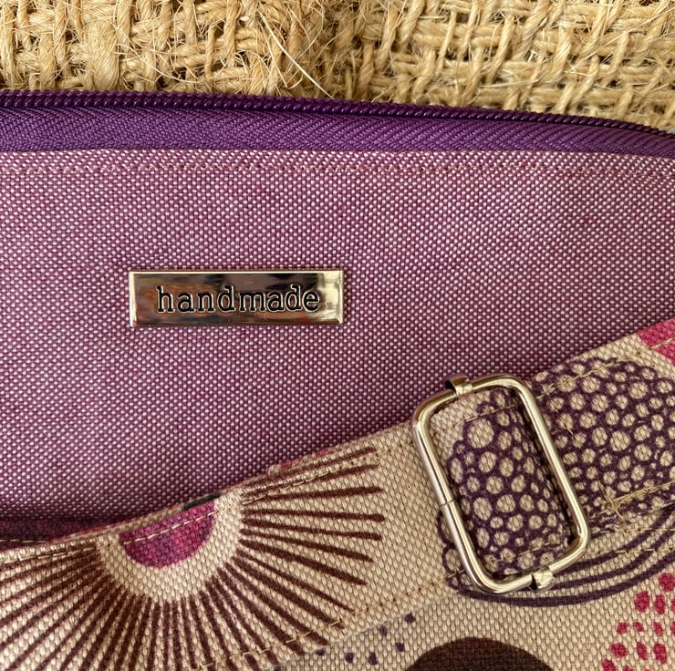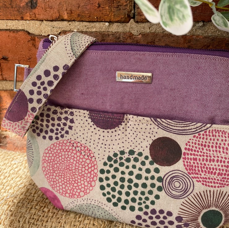 In a durable mauve 80% cotton rich linen look fabric and a 80% cotton rich linen look multicoloured abstract circle print front. This bag has a long adjustable shoulder strap measuring approx full length, 1m 40cm which is detachable from the main bag.
