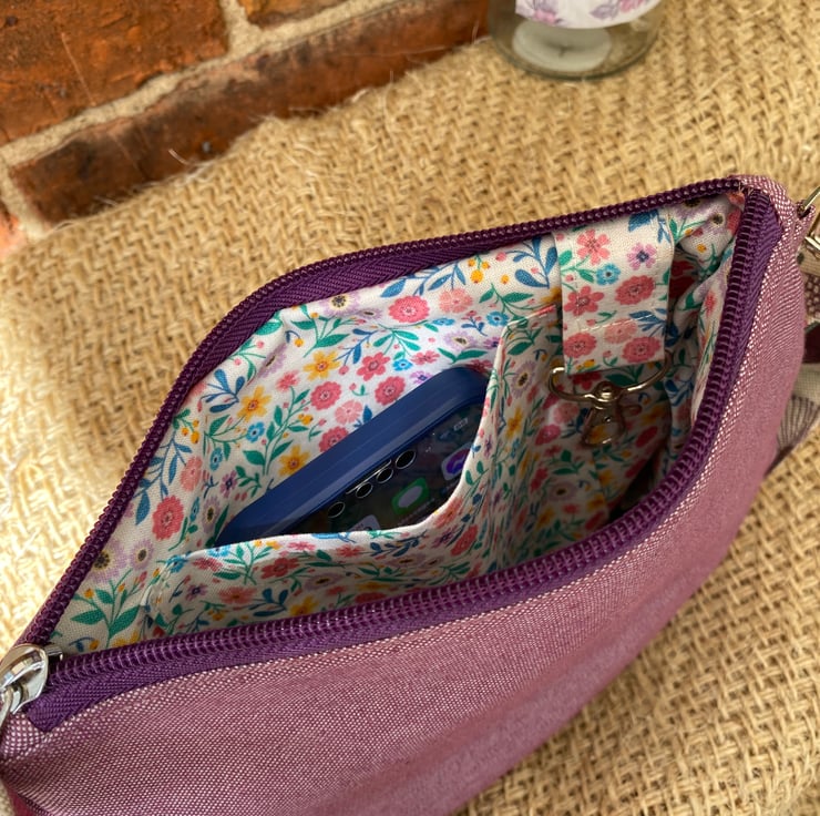 This bag also features a small lined front pocket with a magnetic clasp. The main compartment of the bag closes with a nylon zip and metal alloy zip pull. Inside the main compartment features a small zipped back pocket, a compartment for mobile phone and a clip for keys. The bag measures approx 19cm height, 25cm wide, with a depth of approximately 10cm.
