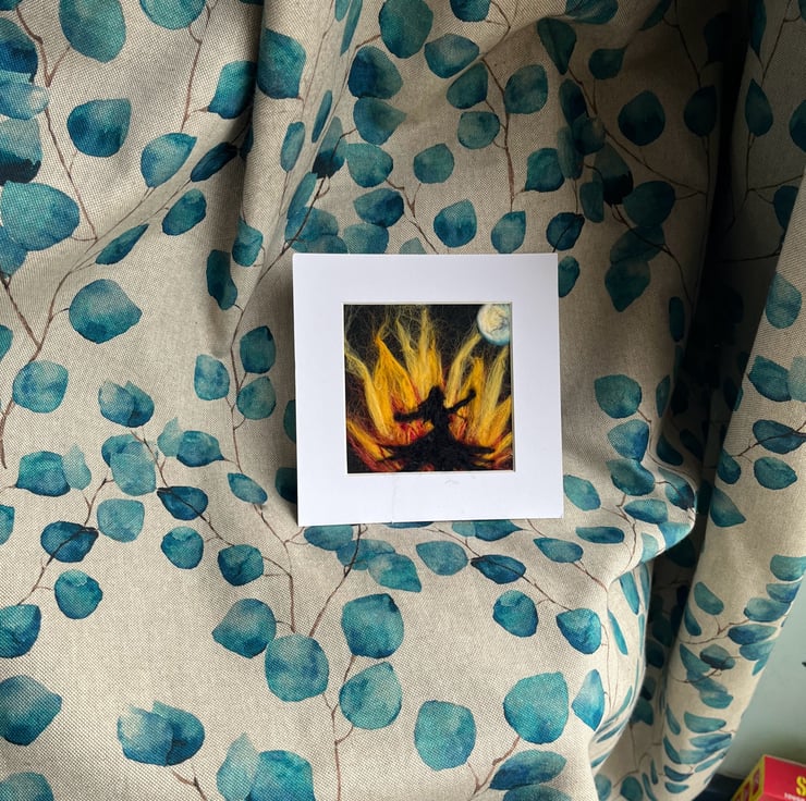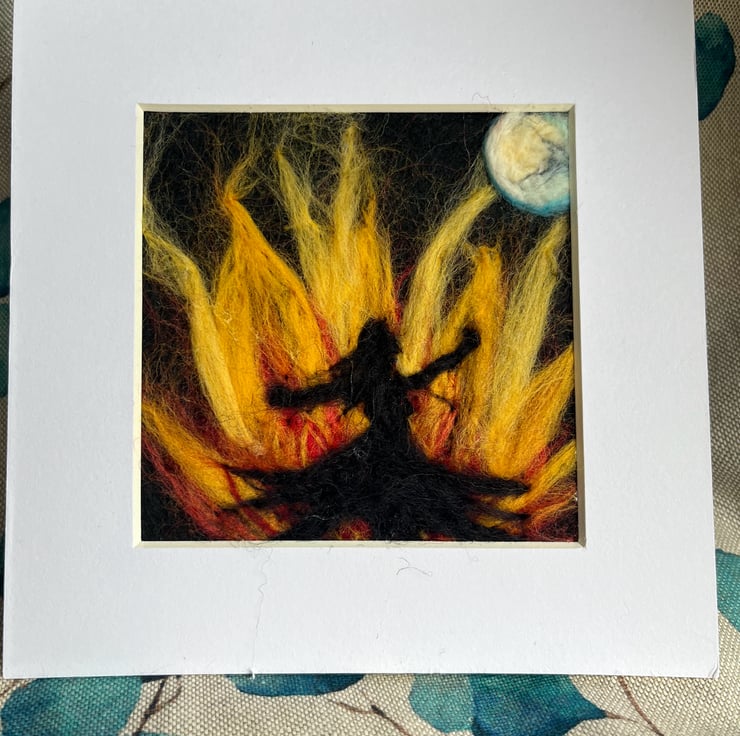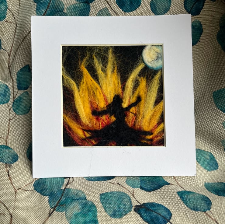 Imagine in silhouette of a figure dancing against a Beltane Fire under a full moon. Original Wool Painting. 15 x 15cm in mount.
