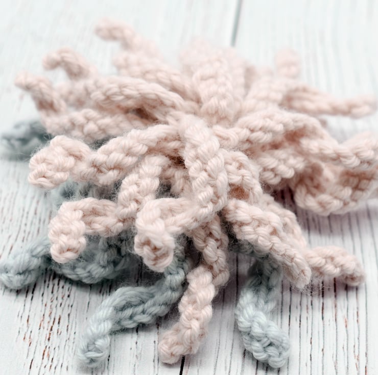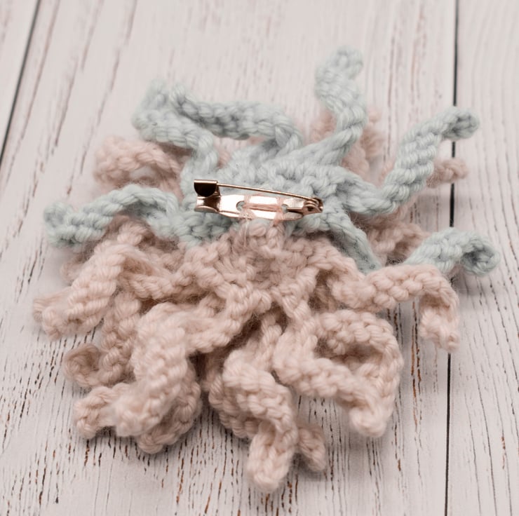 Knitted in pastel pink and blue yarn, this multi petal flower is hand sewn with a brooch bar pin is safely secured at the back.